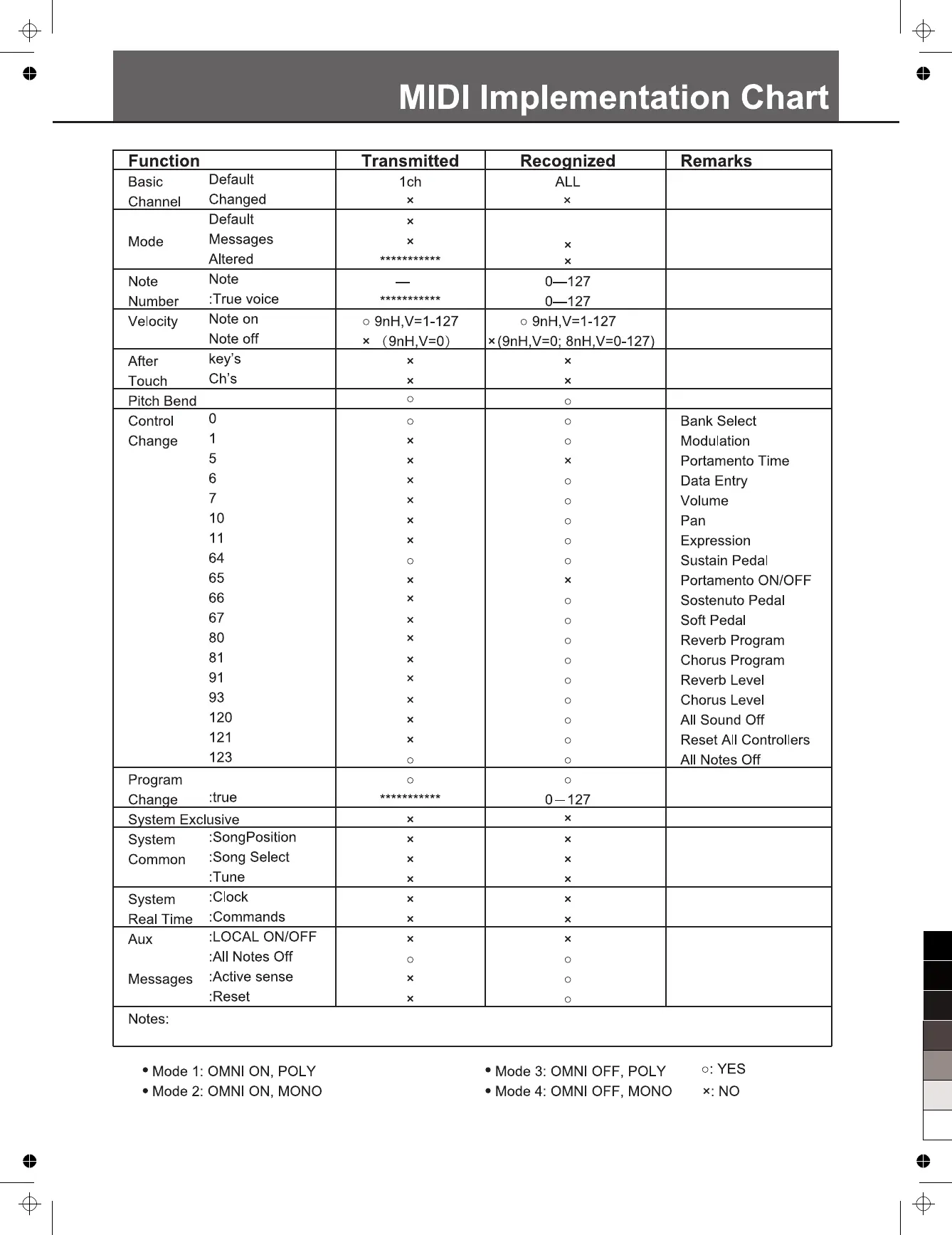 Medeli M311 - MIDI Implementation Chart; MIDI Transmitted and Recognized Data; MIDI Control and System Messages