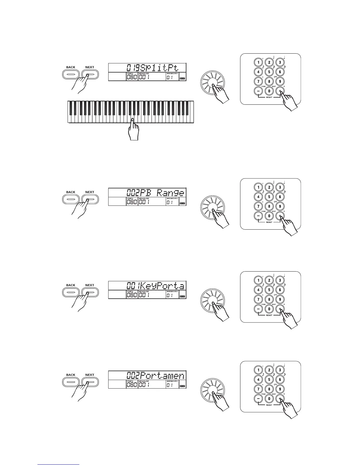 Press the button to portamento or modulation with the , , -[NEXT] dial,[+/YES] [-/NO] [0] [9].