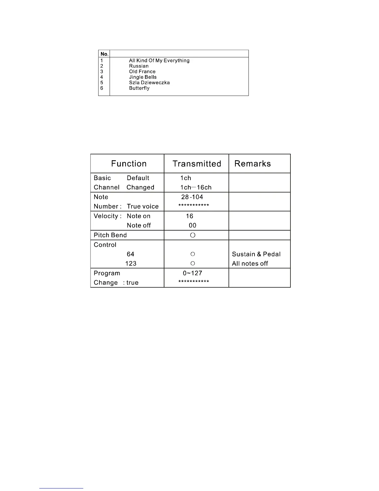 Medeli MC70 - Appendix 4-Demo List; Appendix 5-MIDI Implementation Chart