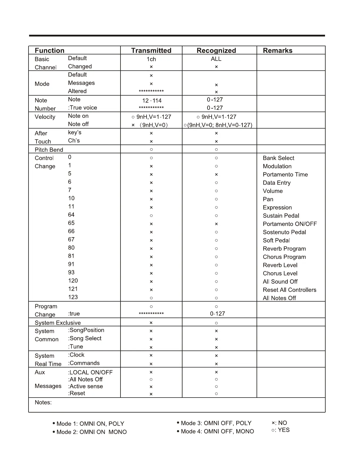 MIDI Implementation Chart