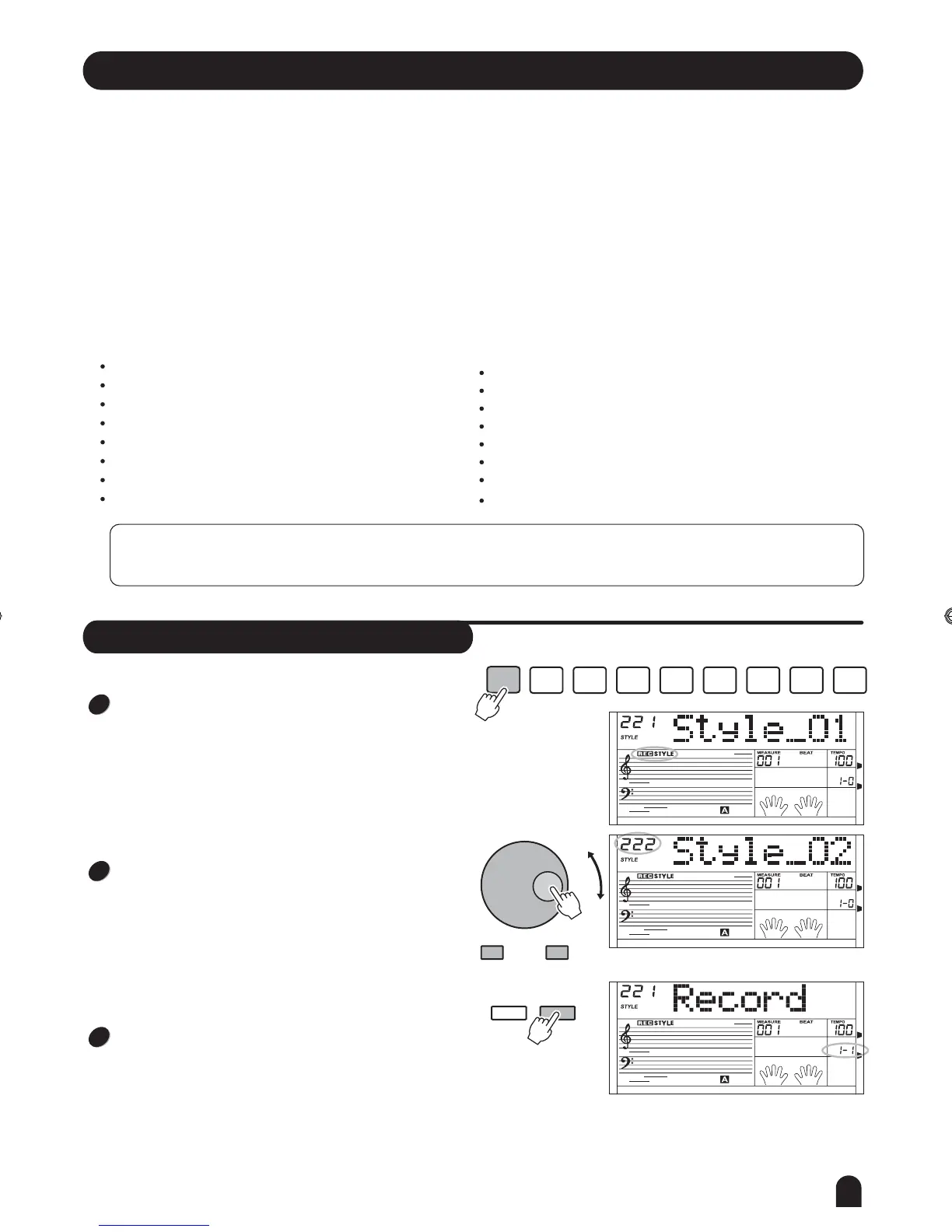 Style record allows user to produce a new rhythm through recording and editing an built-in style. Be note that the built-in
