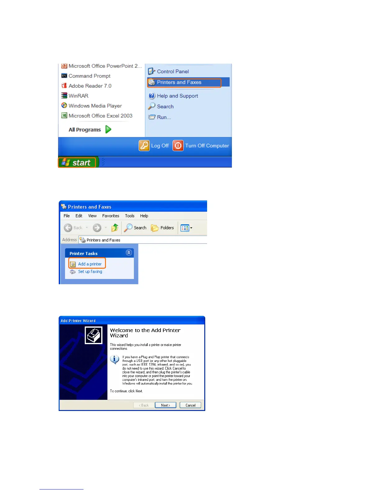 Start > Printers and Faxes to add a printer.