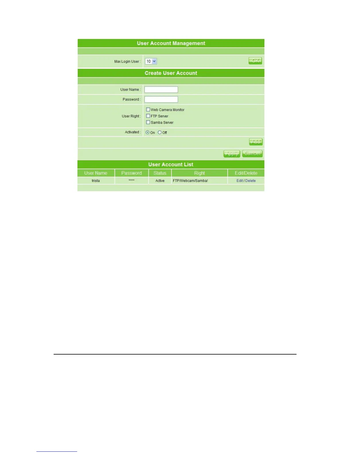 After finishing the above, click Add button to create user account. Click on Apply button