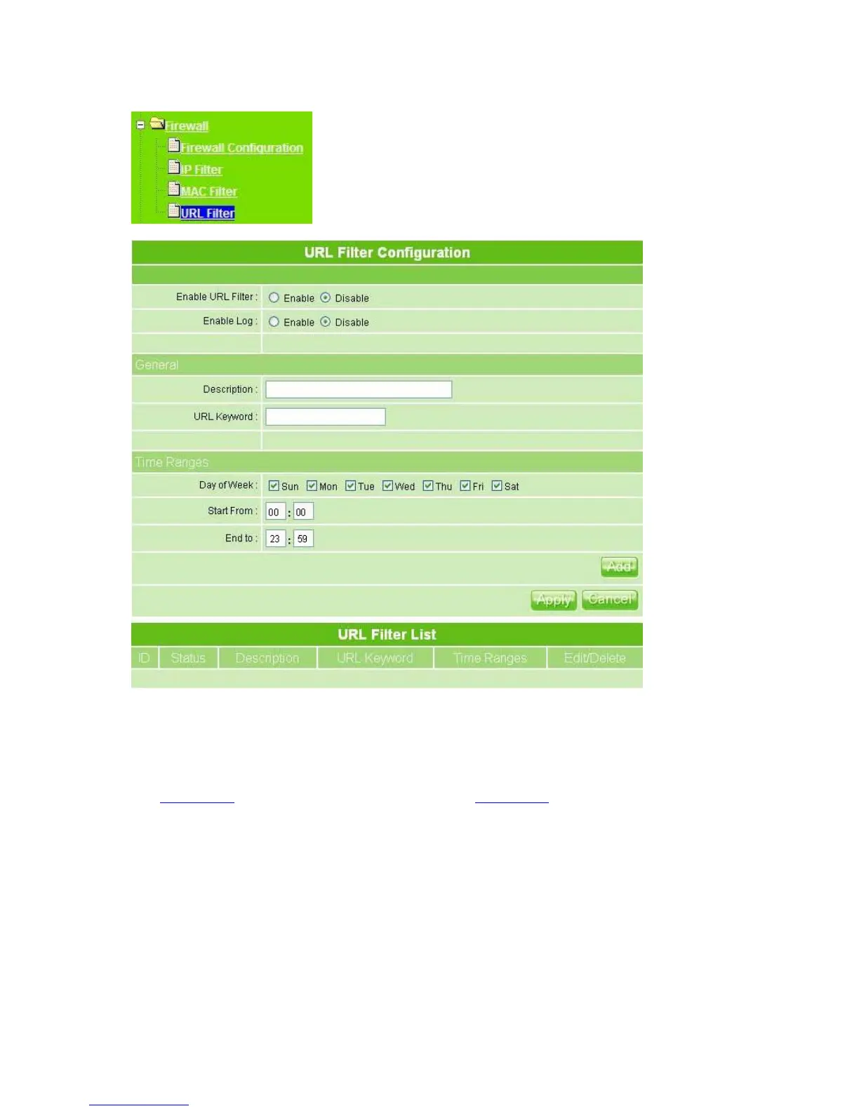 1. Enable URL Filter: Check enable or disable to apply URL filter function.