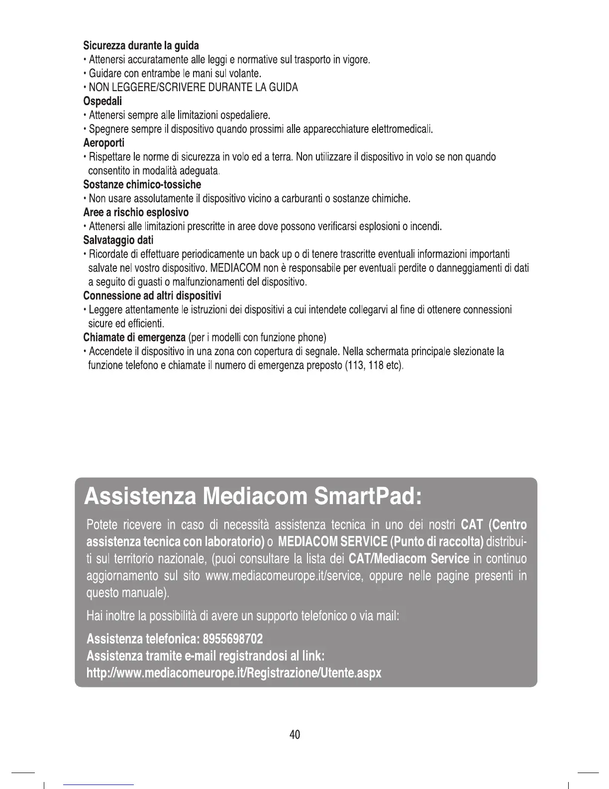 Mediacom SmartPad - Driving Safety; Hospital and Airport Safety; Hazardous Areas and Data Backup; Connecting Devices & Emergency Calls