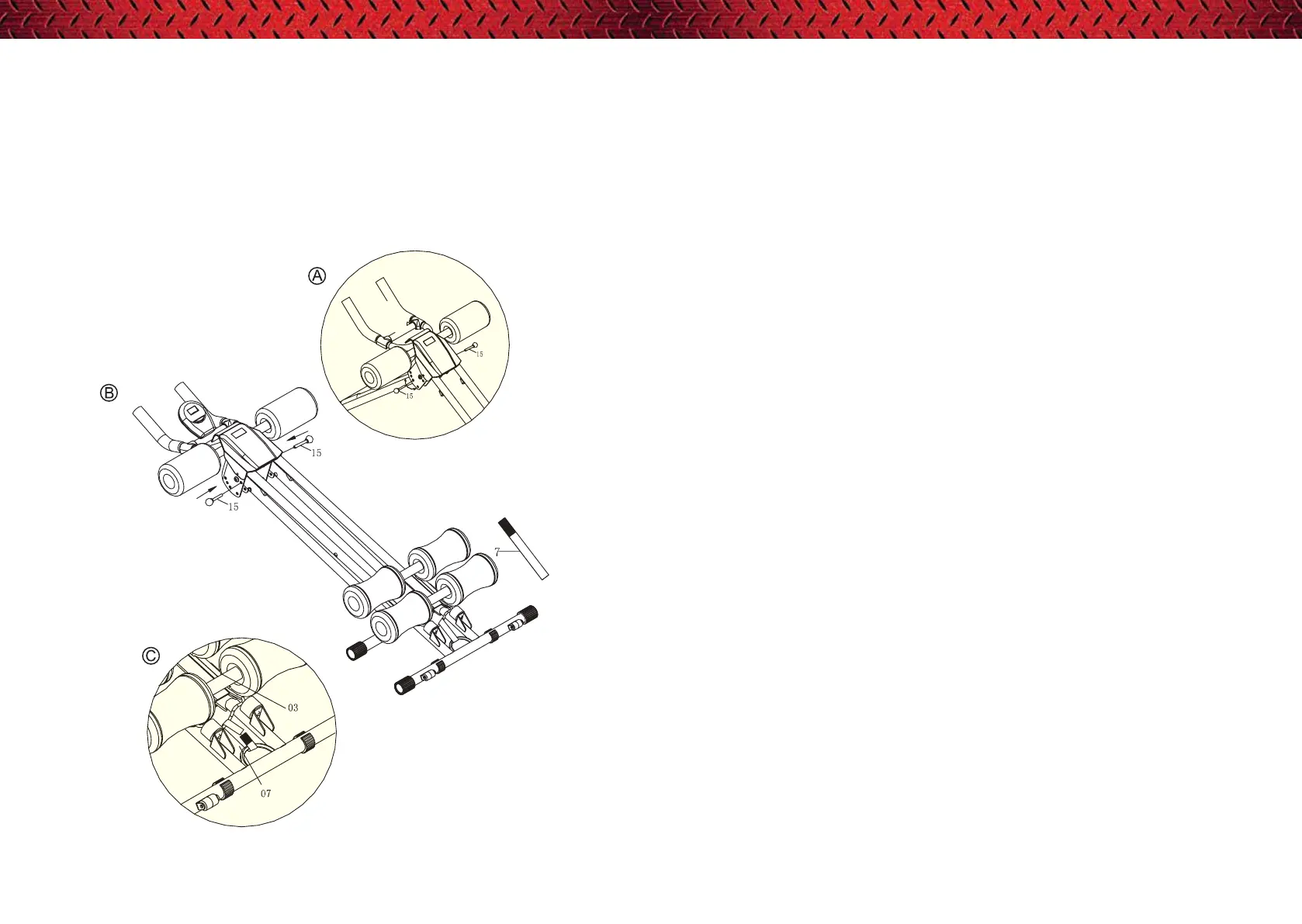 B) Attach slide tube (03) onto bottom of front main frame (01) by velcro (07) as figure C.