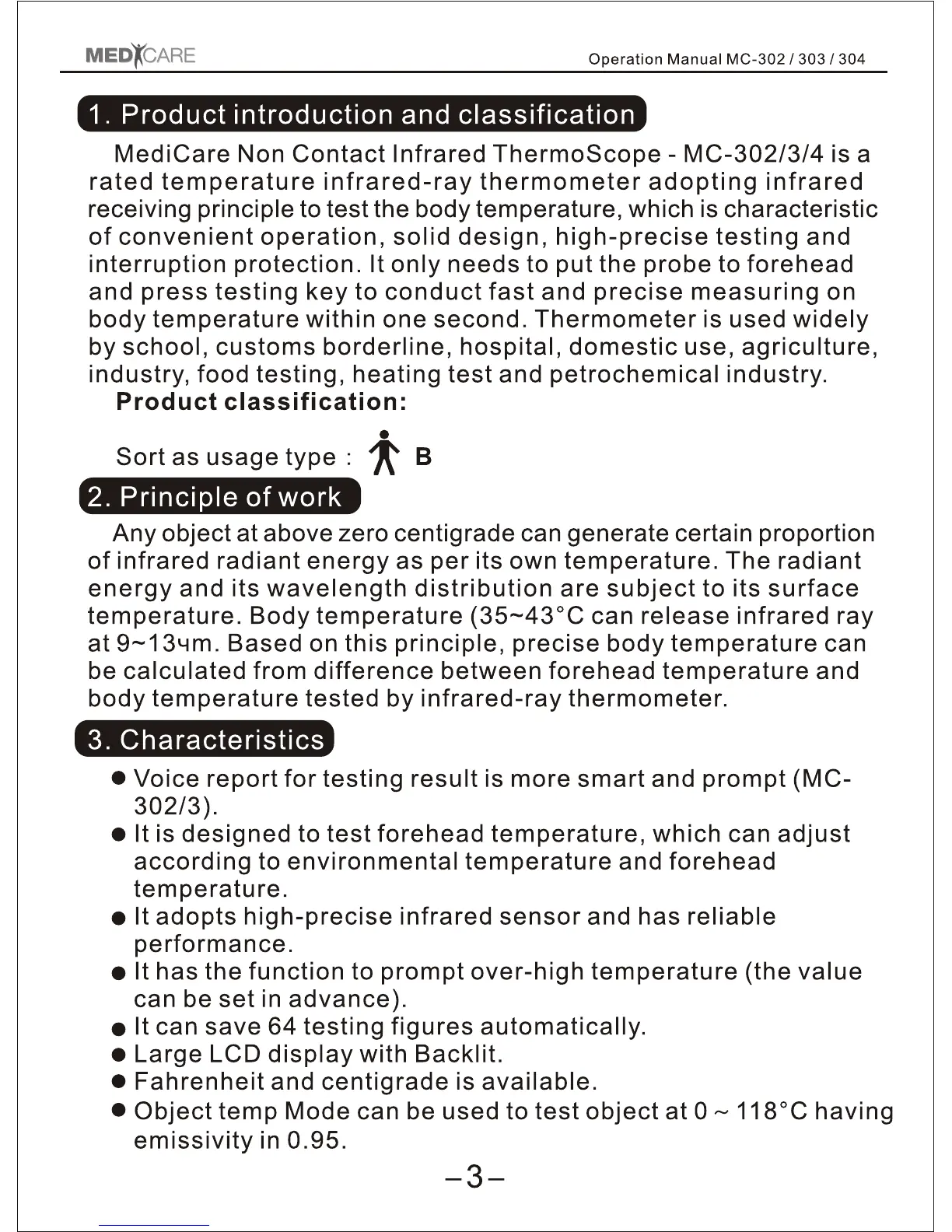 Medicare MC-302 - Product Introduction and Classification; Principle of Work; Product Characteristics