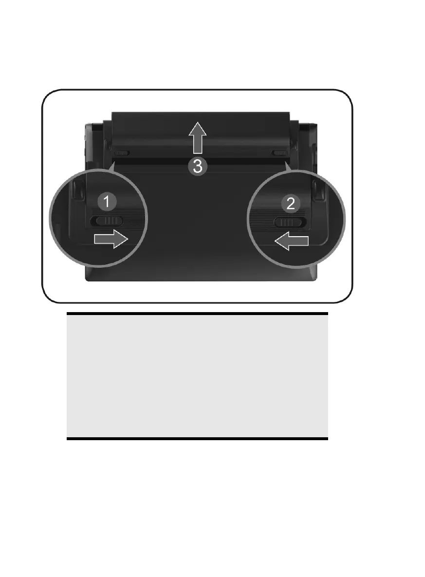 Para extraer el bloque de la batería, deslice el pestillo de seguridad ( y )