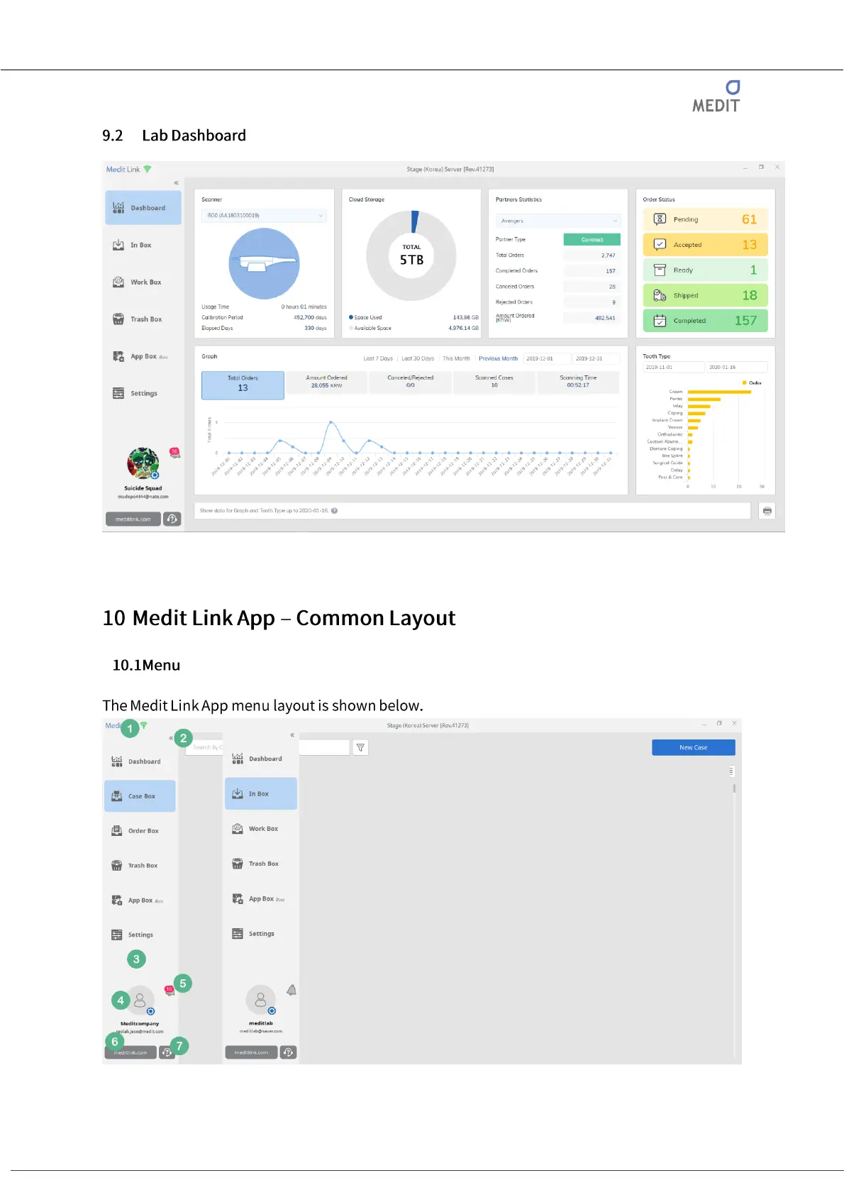 Medit Link - 9.2 Lab Dashboard; 10 Medit Link App - Common Layout; 10.1 Menu