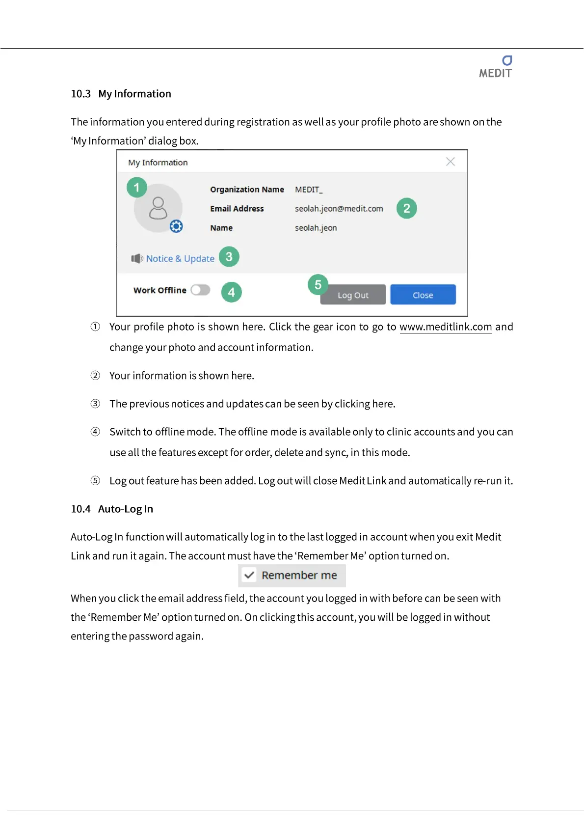 Medit Link - 10.3 My Information; 10.4 Auto-Log In