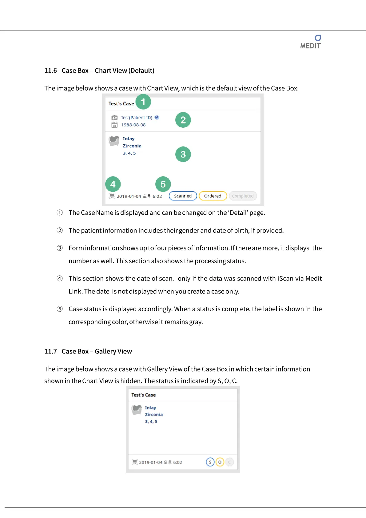 Medit Link - 11.6 Case Box - Chart View (Default); 11.7 Case Box - Gallery View