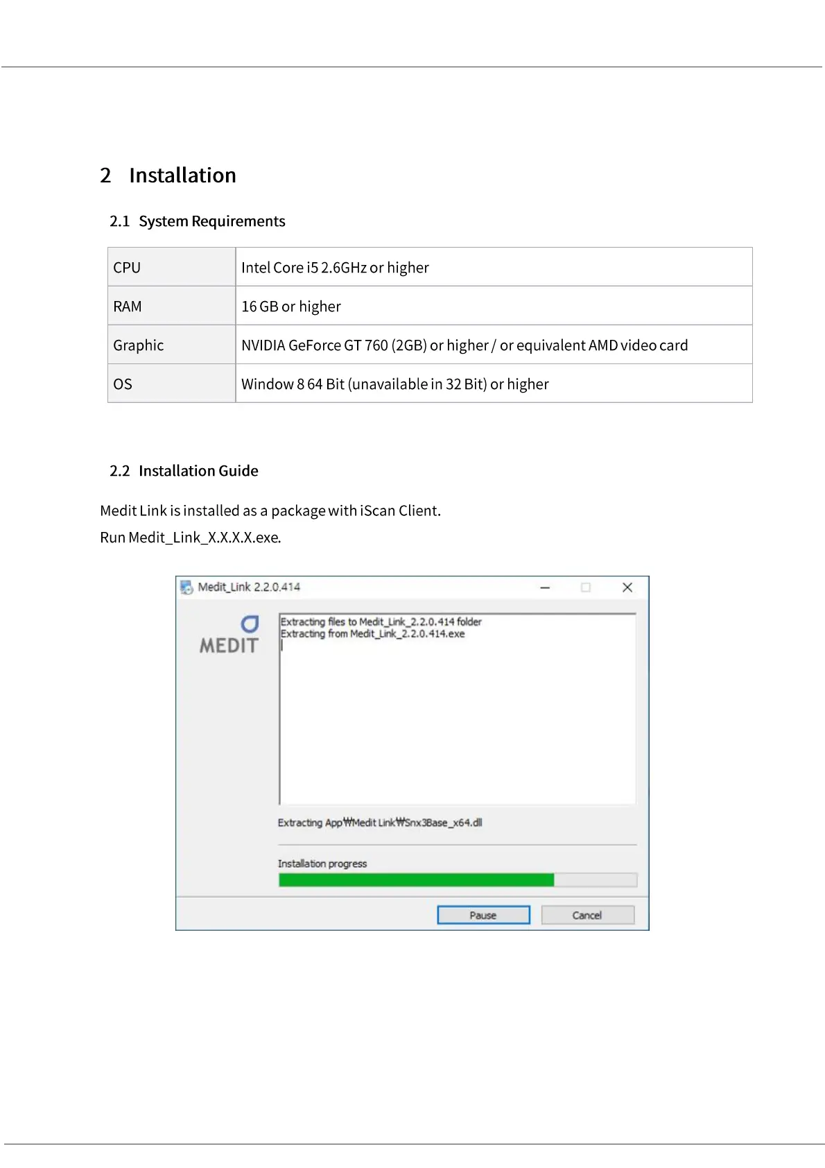 Medit Link - 2 Installation; 2.1 System Requirements; 2.2 Installation Guide