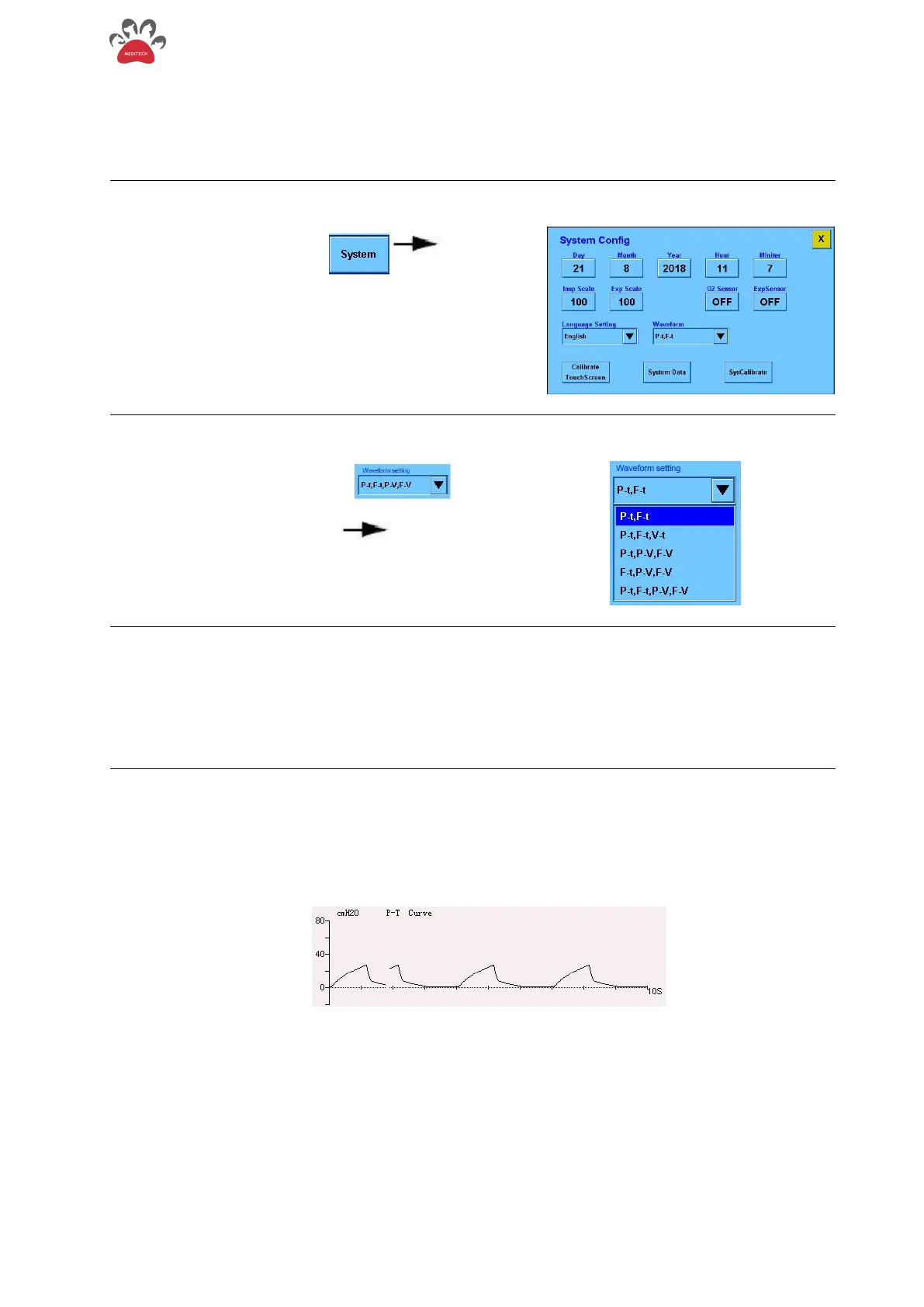 The system waveform can be set in 4 combinations (P-t, F-t; P-t, F-t, V-t; P-t, P-V, F-V; F-t, P-V, F-V).