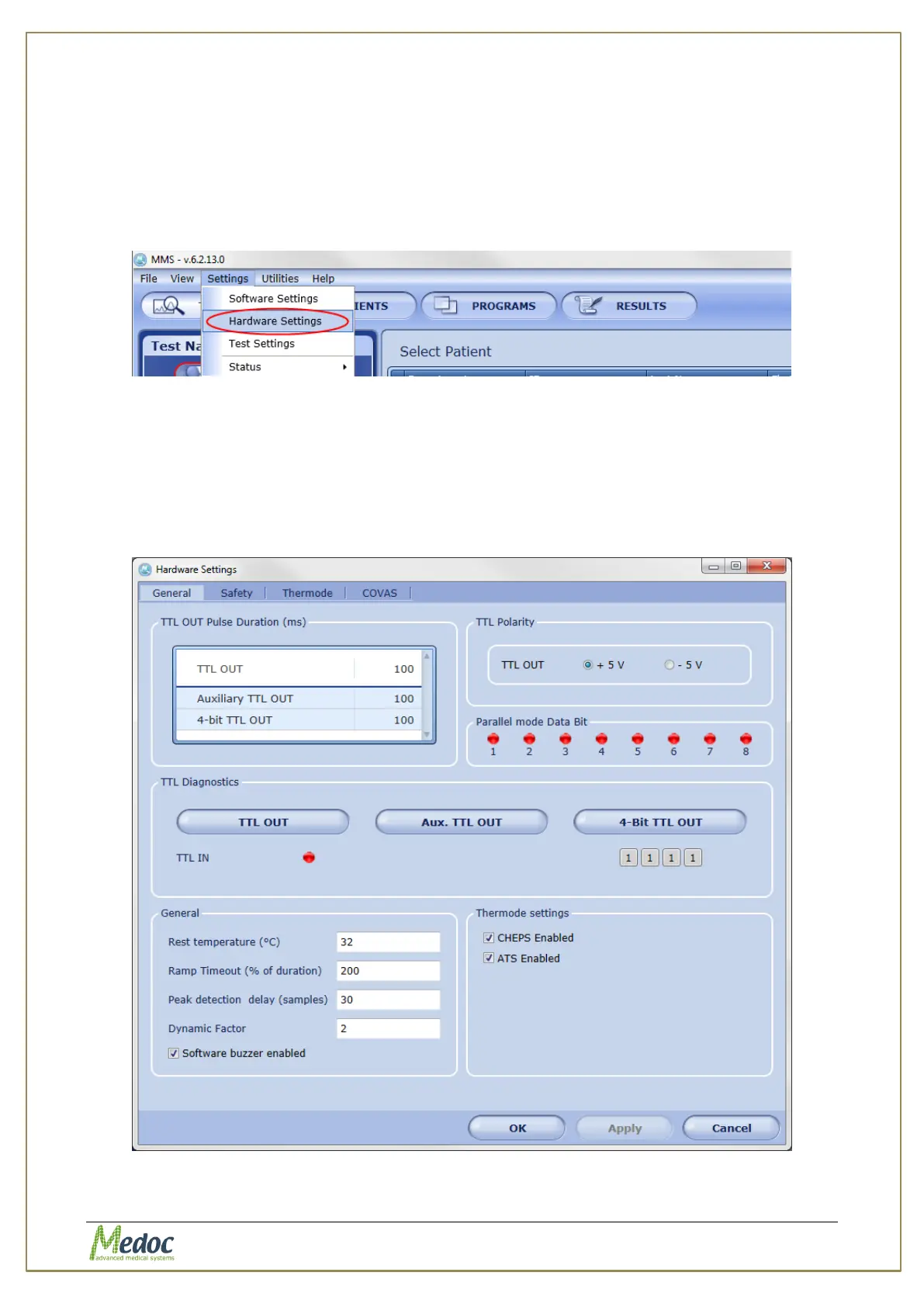 The Hardware Settings menu includes all hardware configurations including TTL IN/OUT