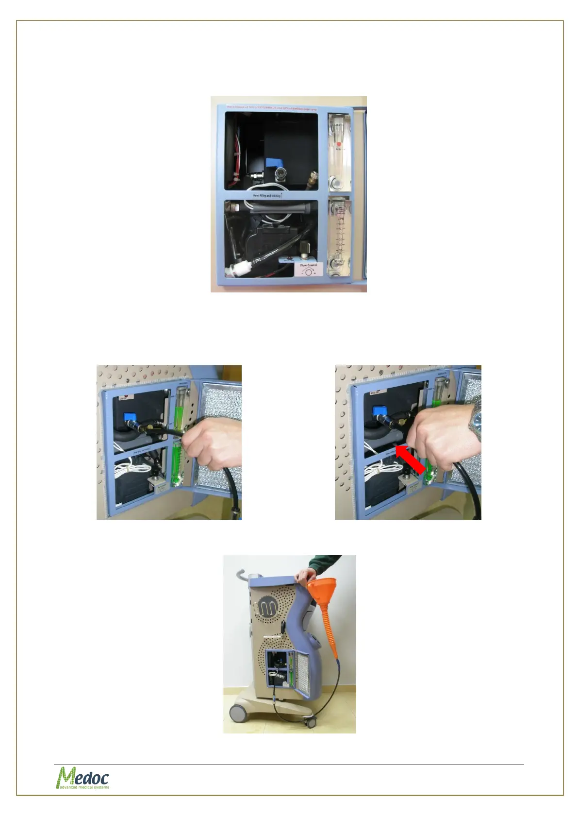 2. Connect the hose and the funnel to the filling tap in the service panel and adjust it into the