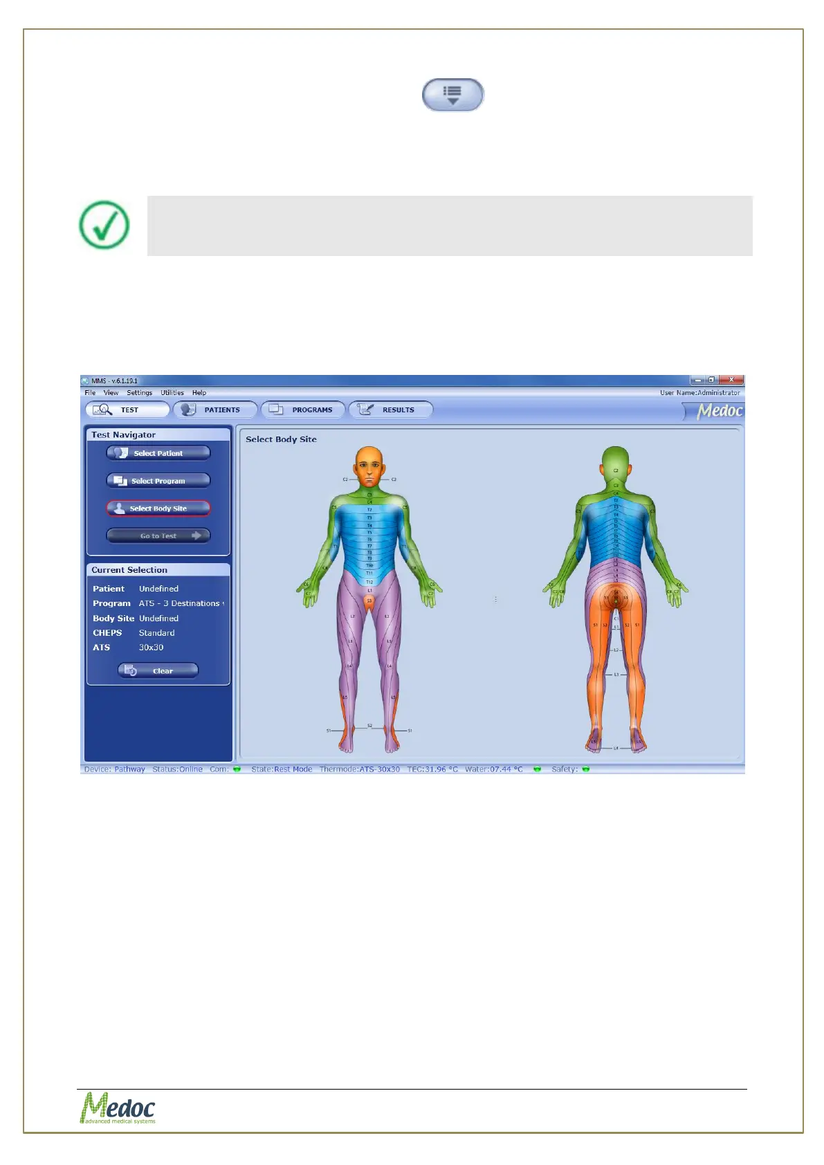 2. Click on the Dermatome (Dermatomic area) you wish to use in the current test.