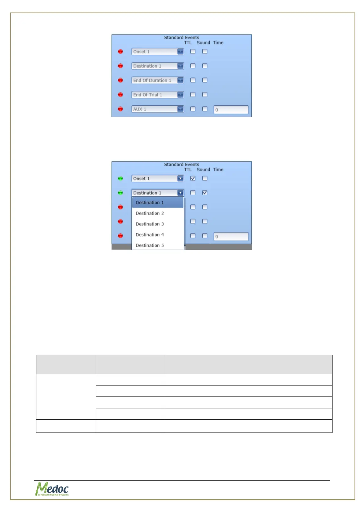 For each event that you want to configure mark the TTL and/or the Sound column to