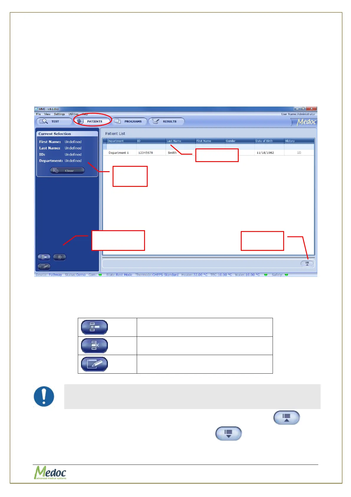 4. The following options are available in the Patient Management screen: