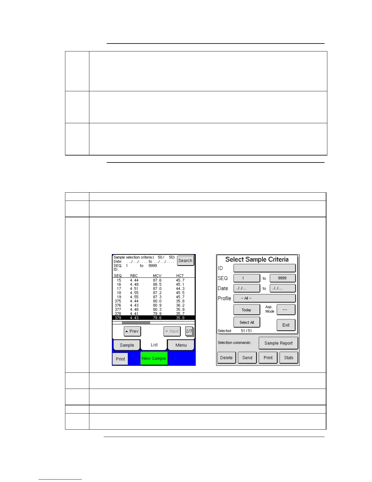 this menu samples can be selected by Sample ID, SEQ, Date, and Sample profile.