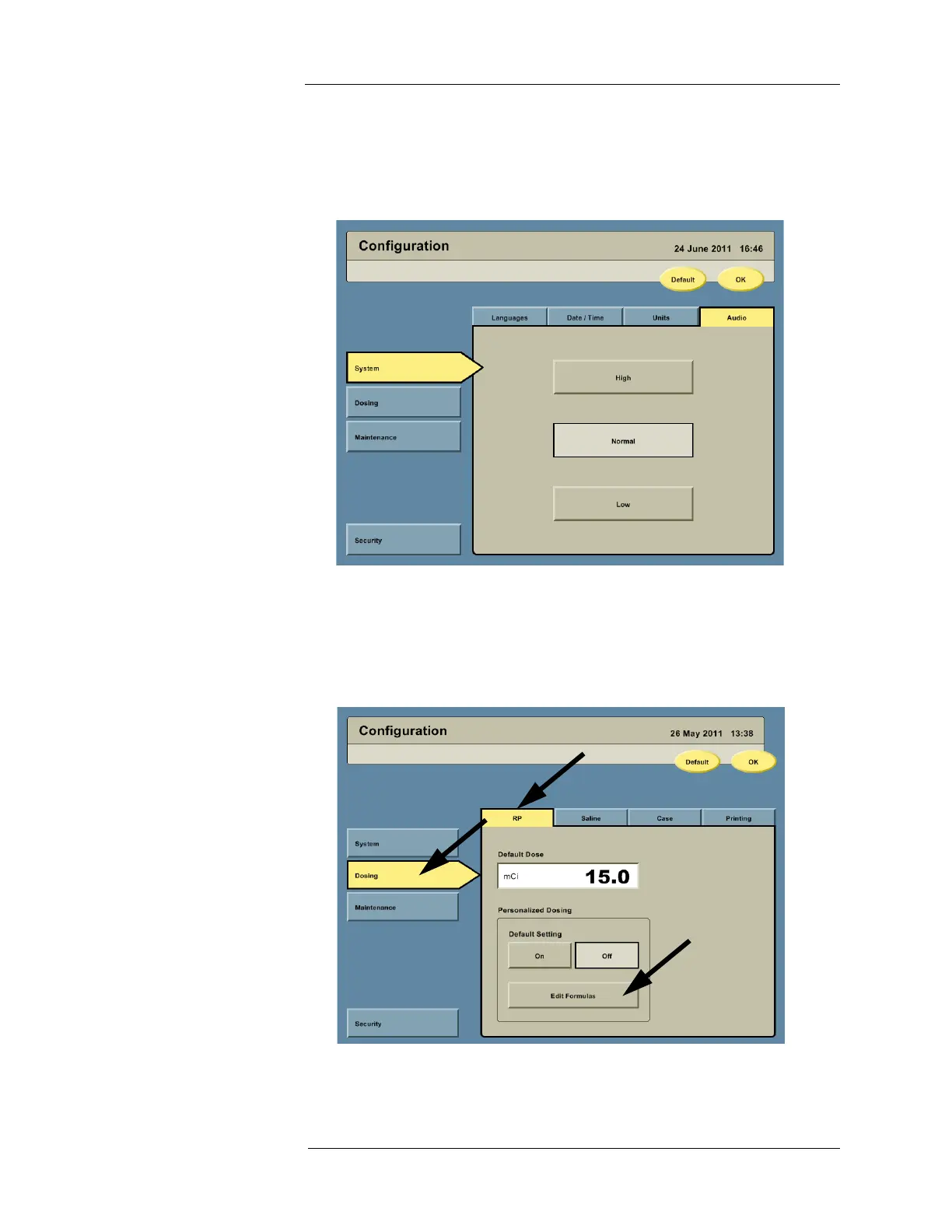 Dosing Settings On the left side of the Configuration screen, press the DOSING button to access the dosing
