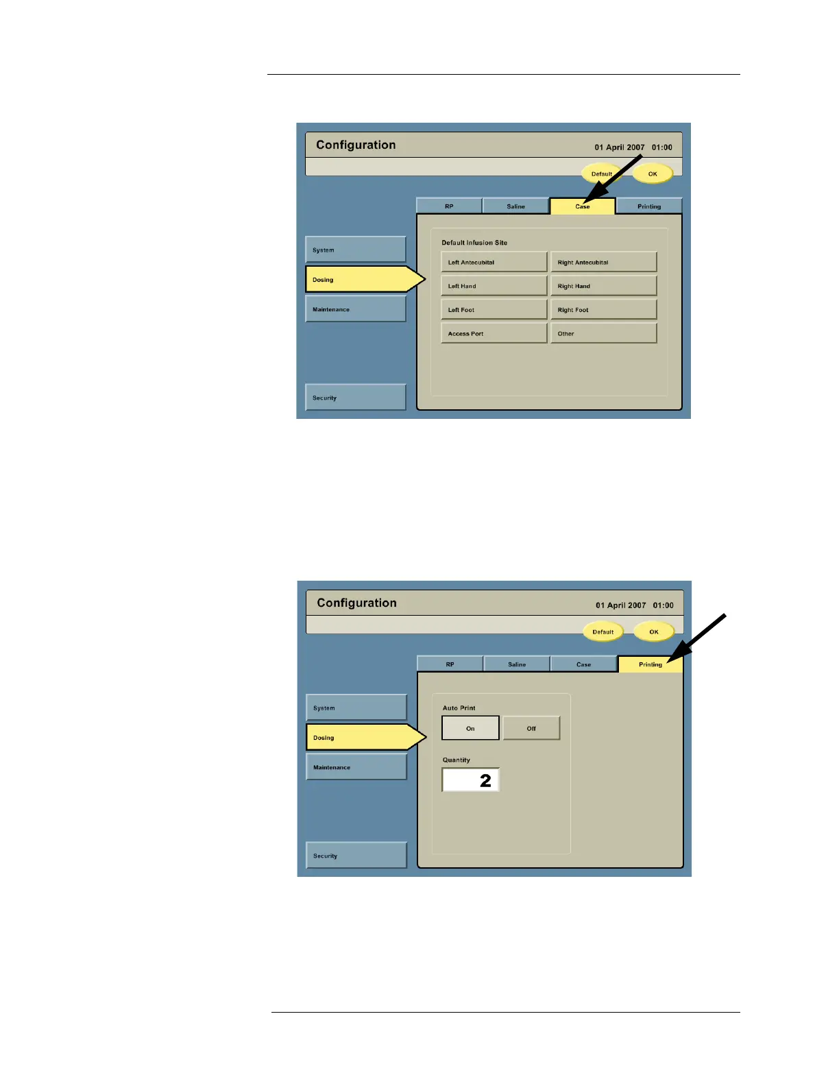 NOTE: If a default infusion site is not configured, the user will be given the option to