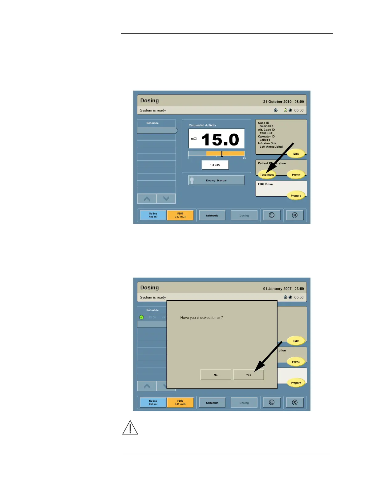 2. The Intego™ PET Infusion System displays a message asking the user to confirm that a