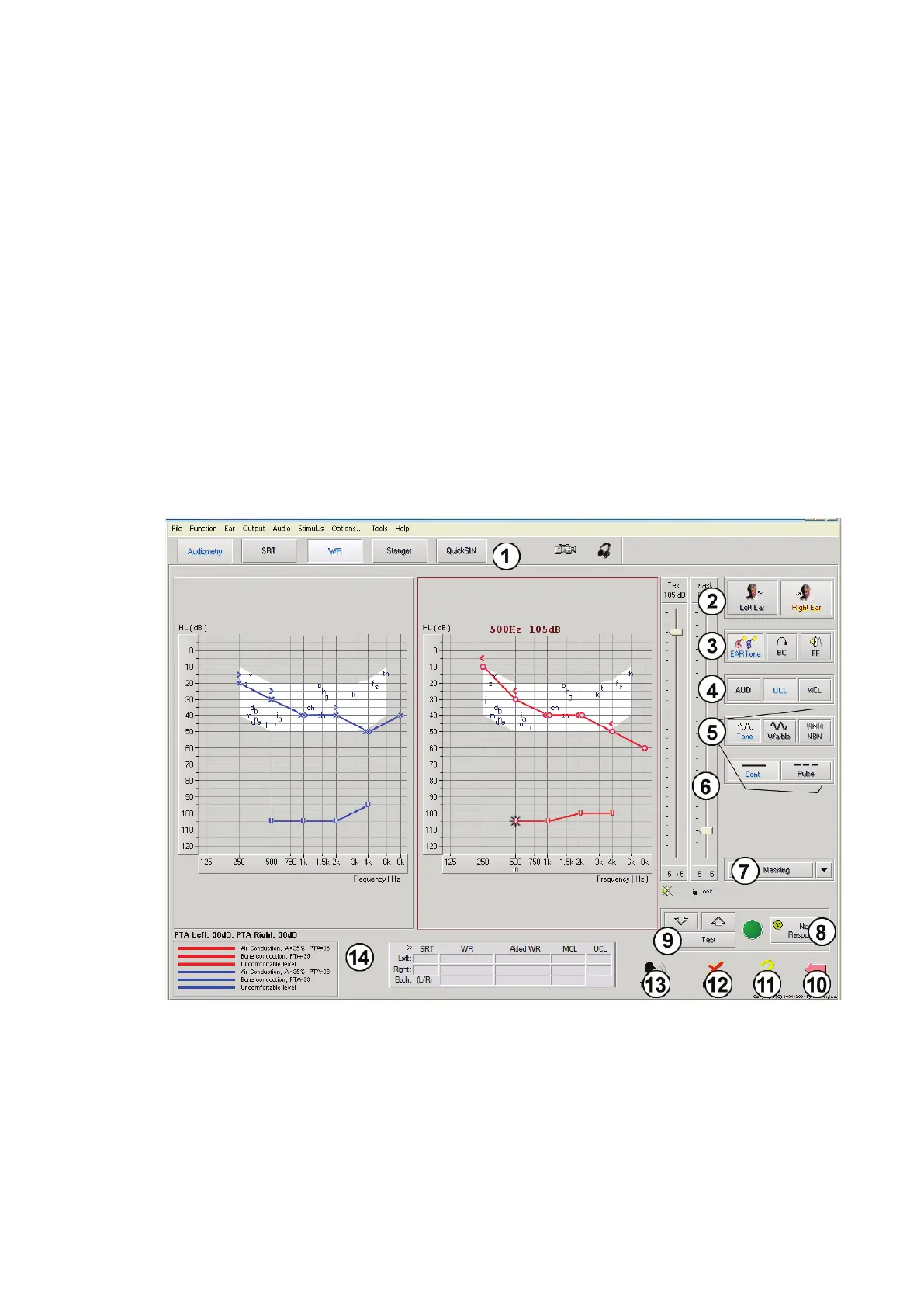 The screen shot below shows the controls which are available from the Audiometer main window.
