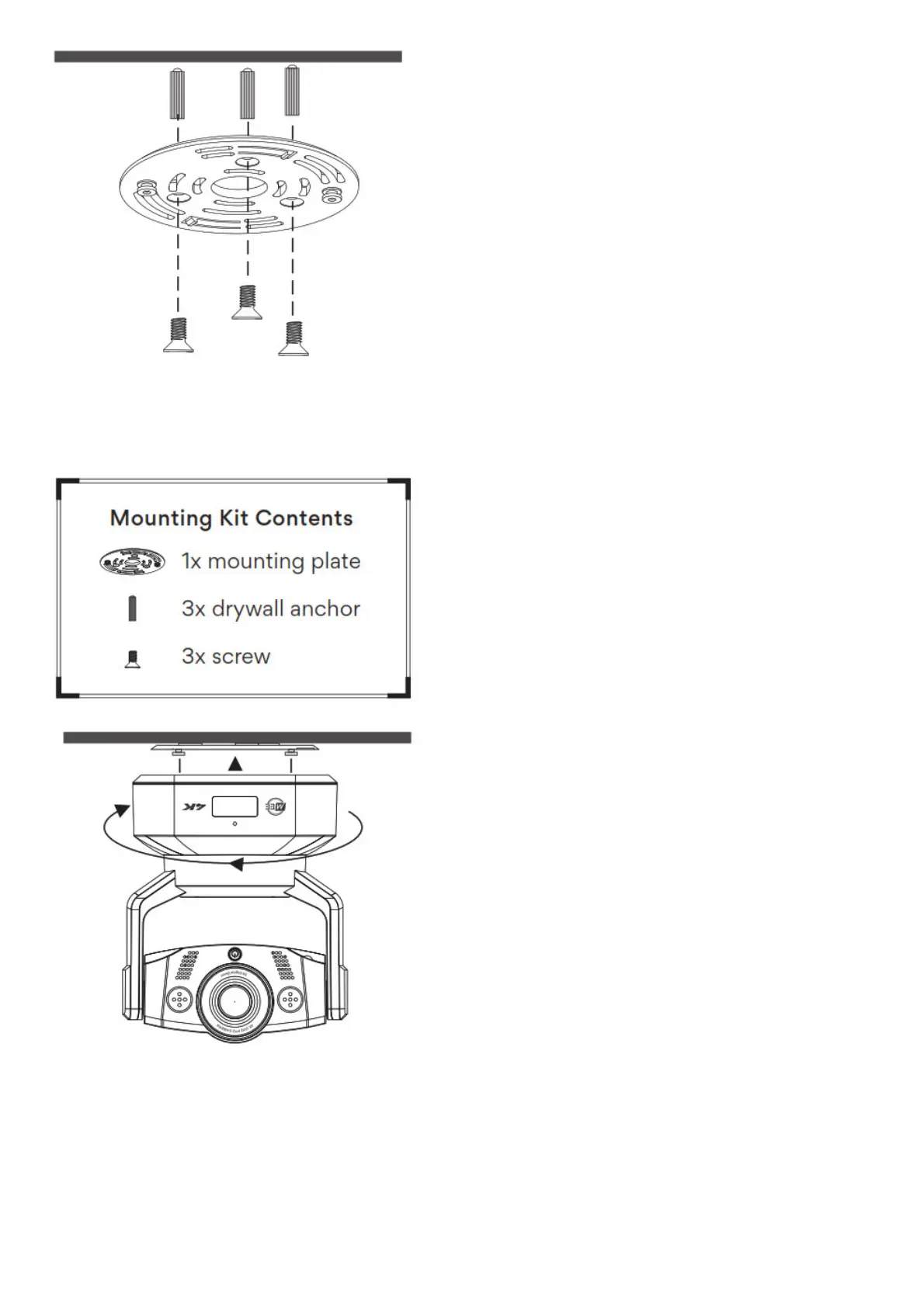 Use the included hardware to attach the mounting plate to the ceiling as shown. Point the arrow on the