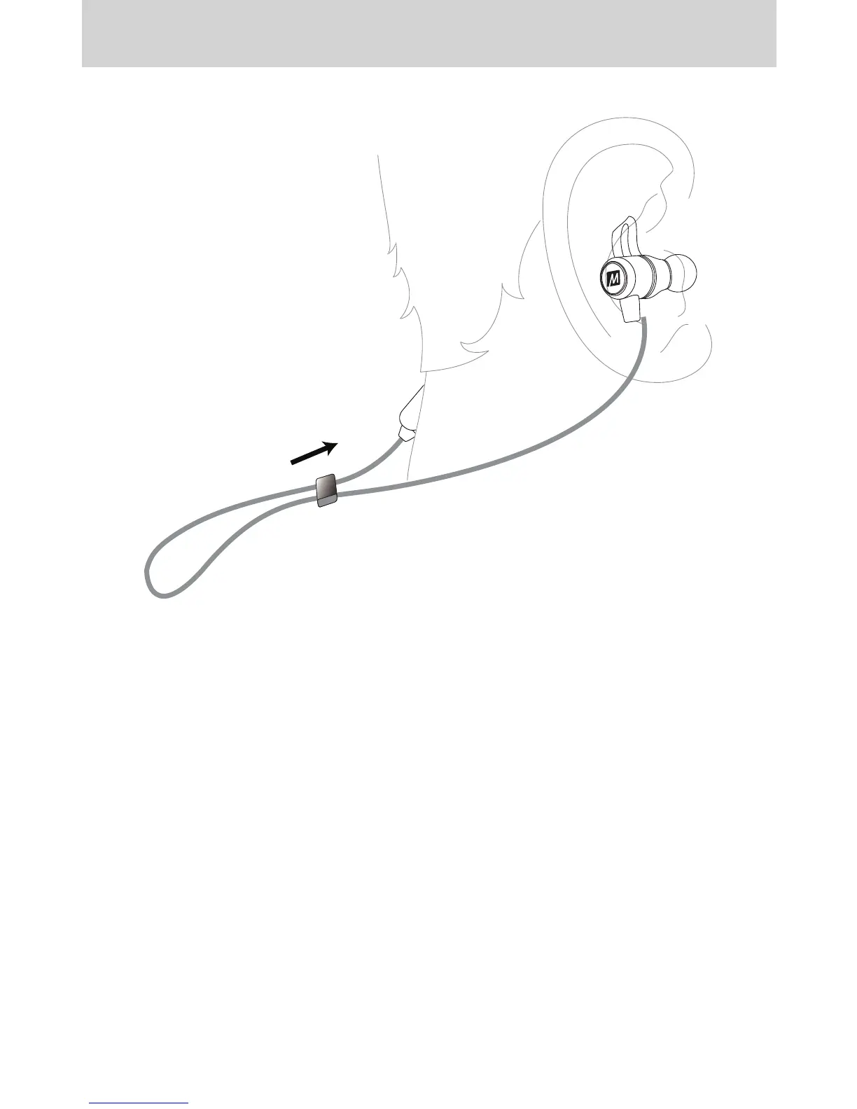步骤4 - 佩戴耳机(续): 收紧线缆滑块,将耳机固定在最稳固舒适的地方,