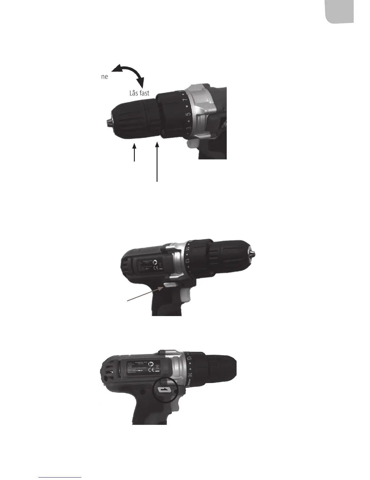 Trykk inn rotasjonsbryteren med pilen pekende mot chucken for rotasjon mot høyre (skru inn).