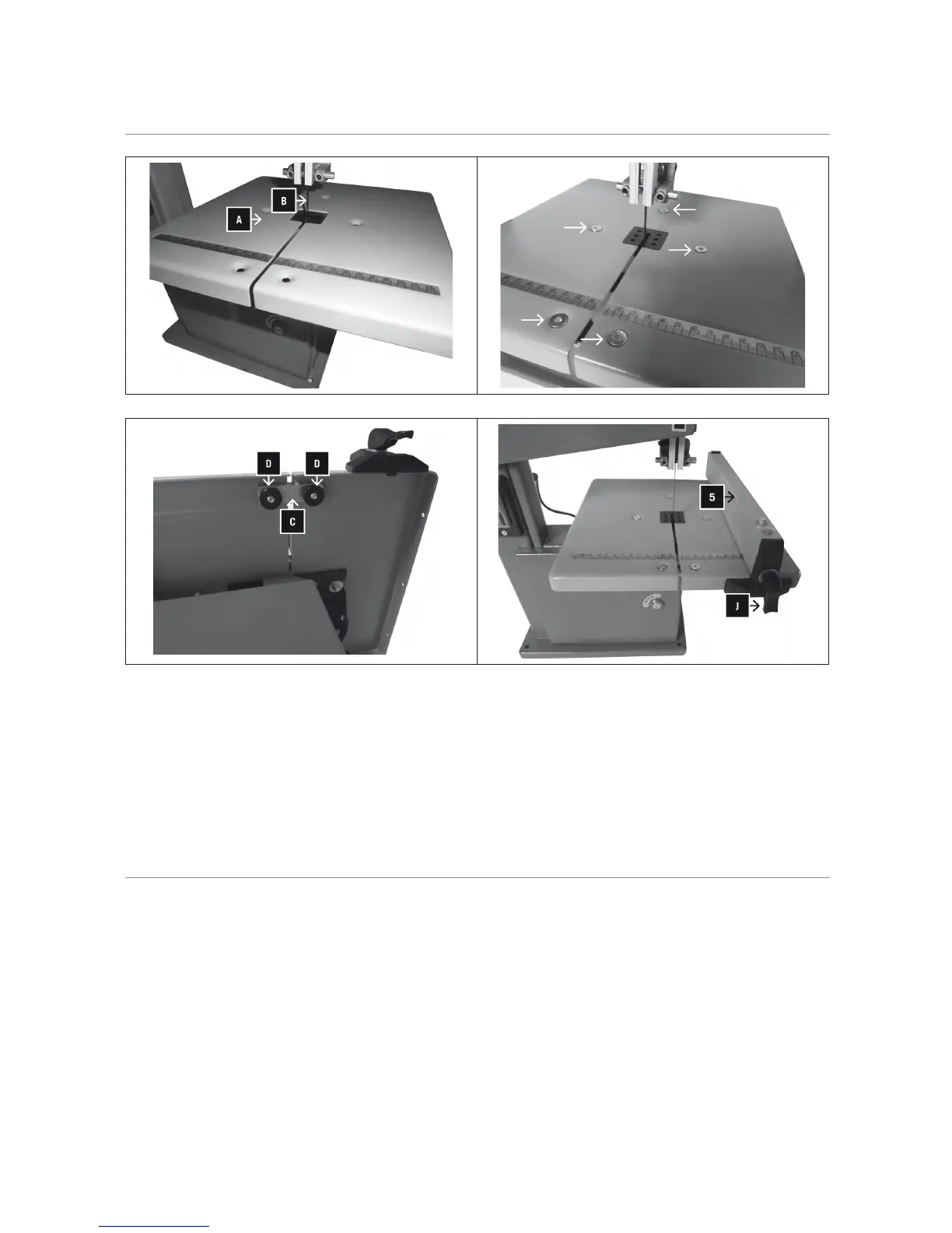 2. Justera bordet så det är parallellt med sågbladet och dra åt de 3 skruvarna. Kontrollera att sågbladet är centrerat i sågbordsinsatsen.