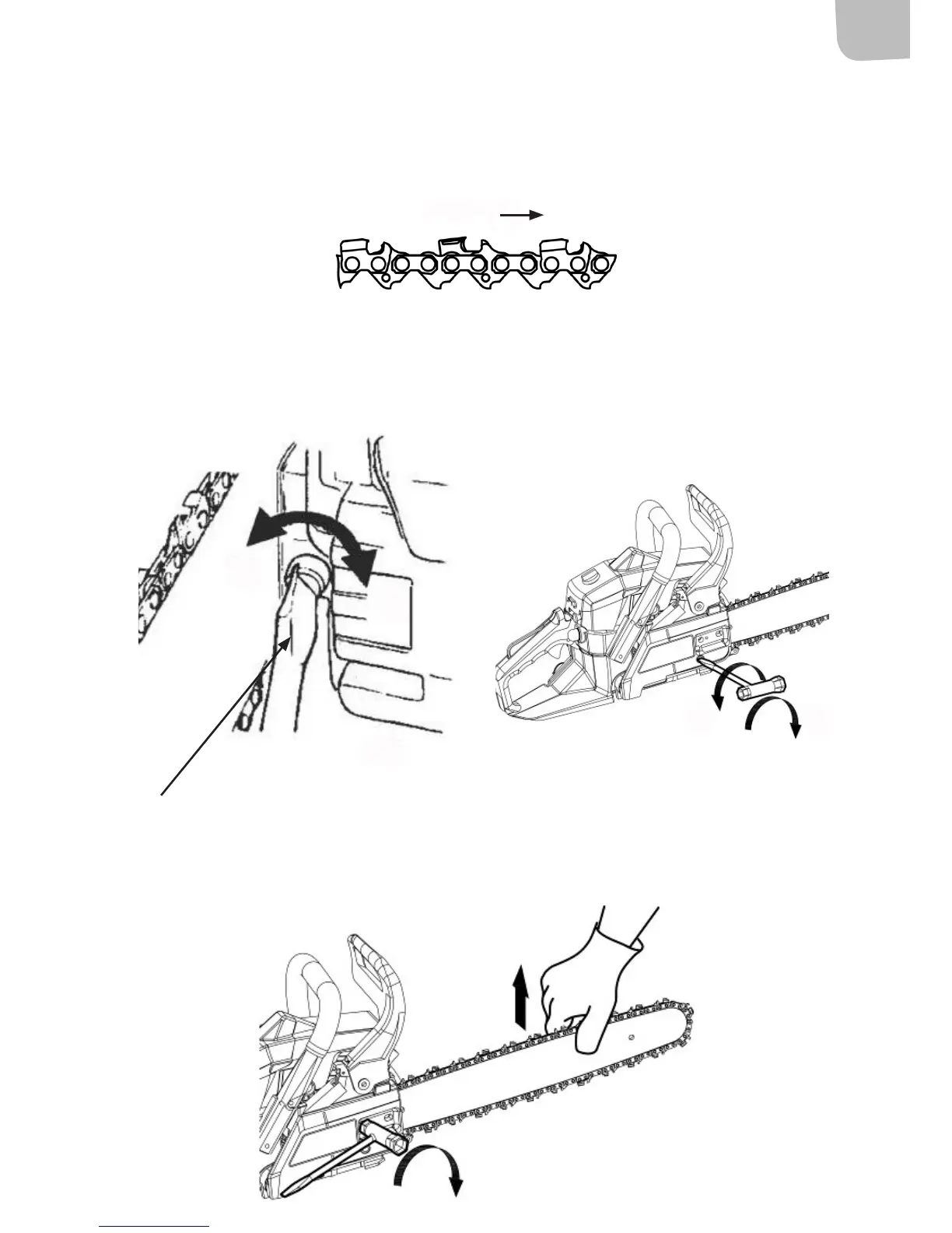 1. While holding up the tip of the bar, adjust the chain tension by turning the tensioner screw