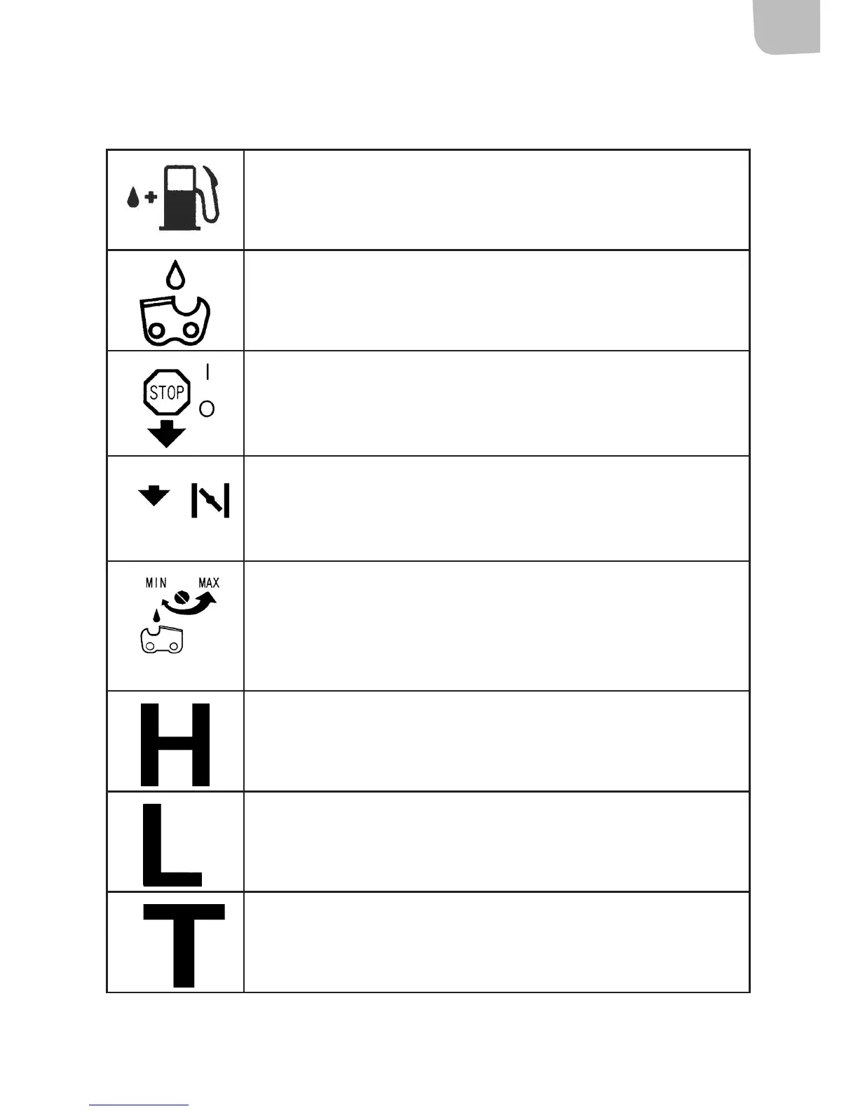 Motorsågen är märkt med präglade symboler för säker användning och skötsel. Var