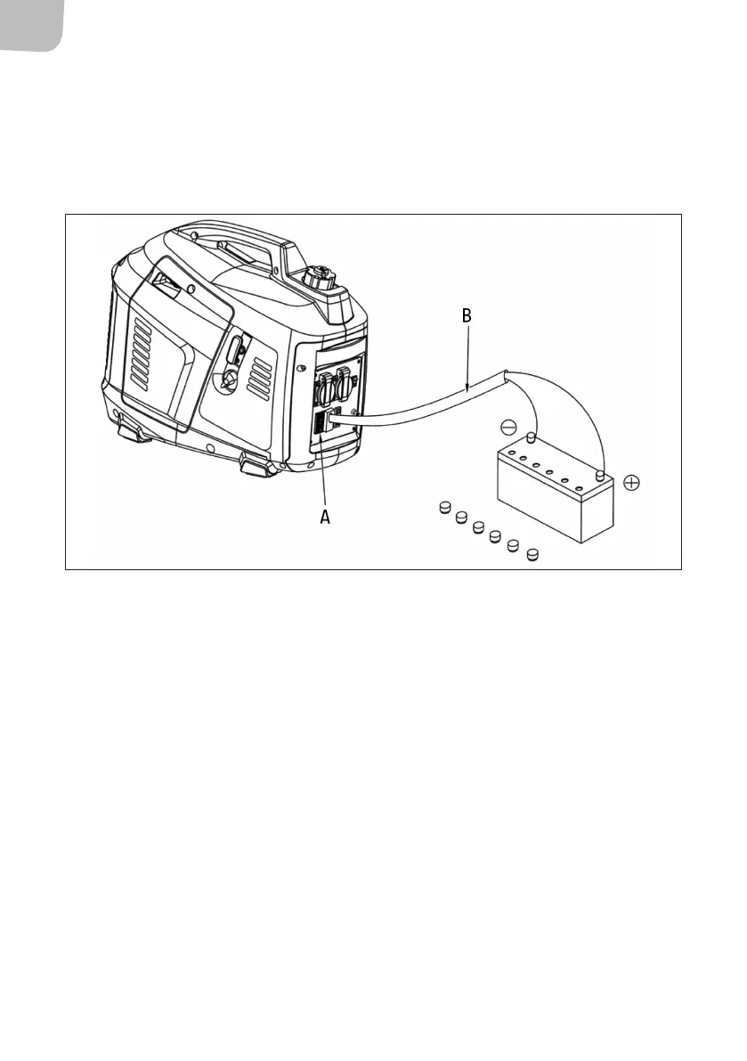 1. Connect the charging cables (B) to the DC outlet (A) on the generator and then to the battery