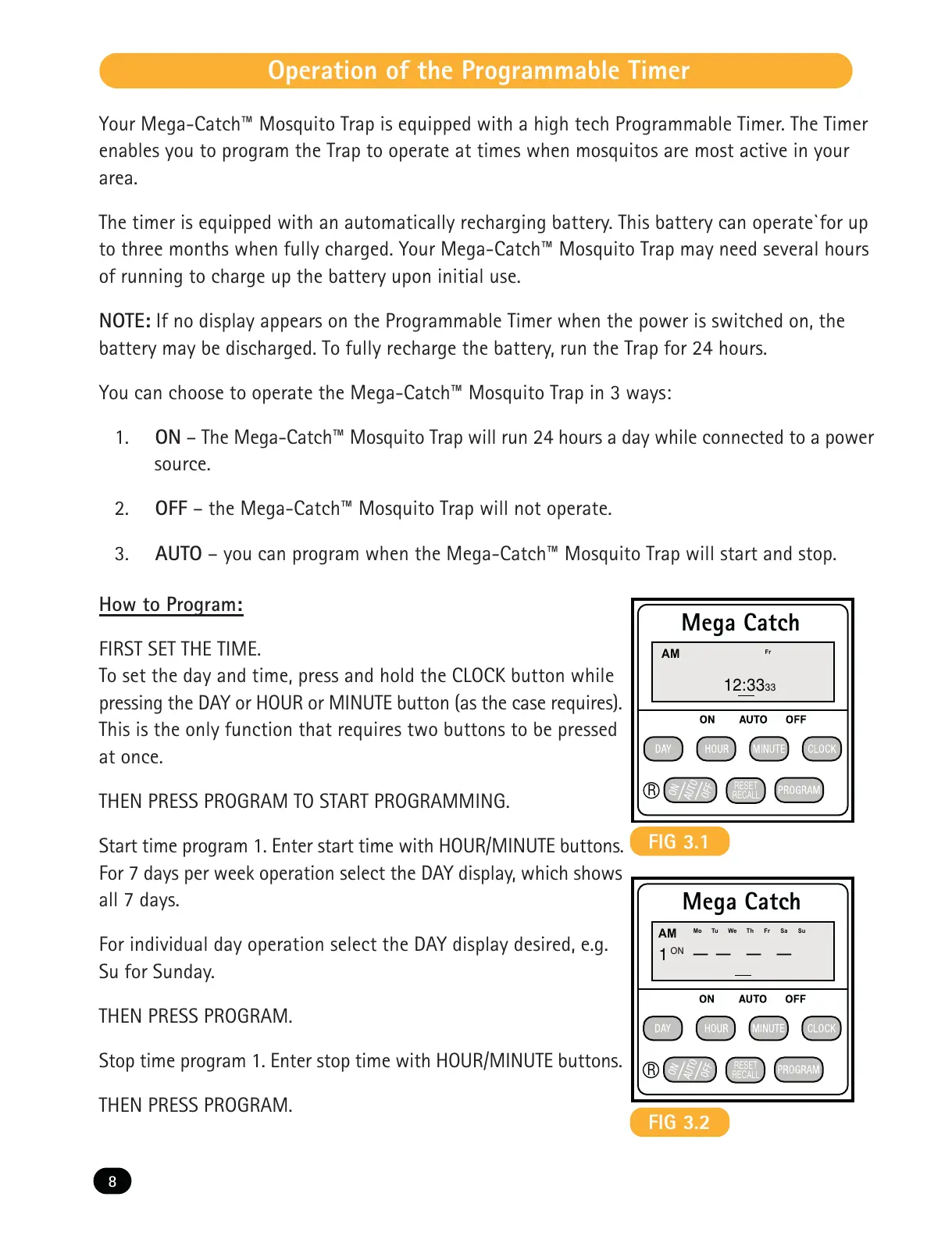 Your Mega-Catch Mosquito Trap is equipped with a high tech Programmable Timer. The Timer