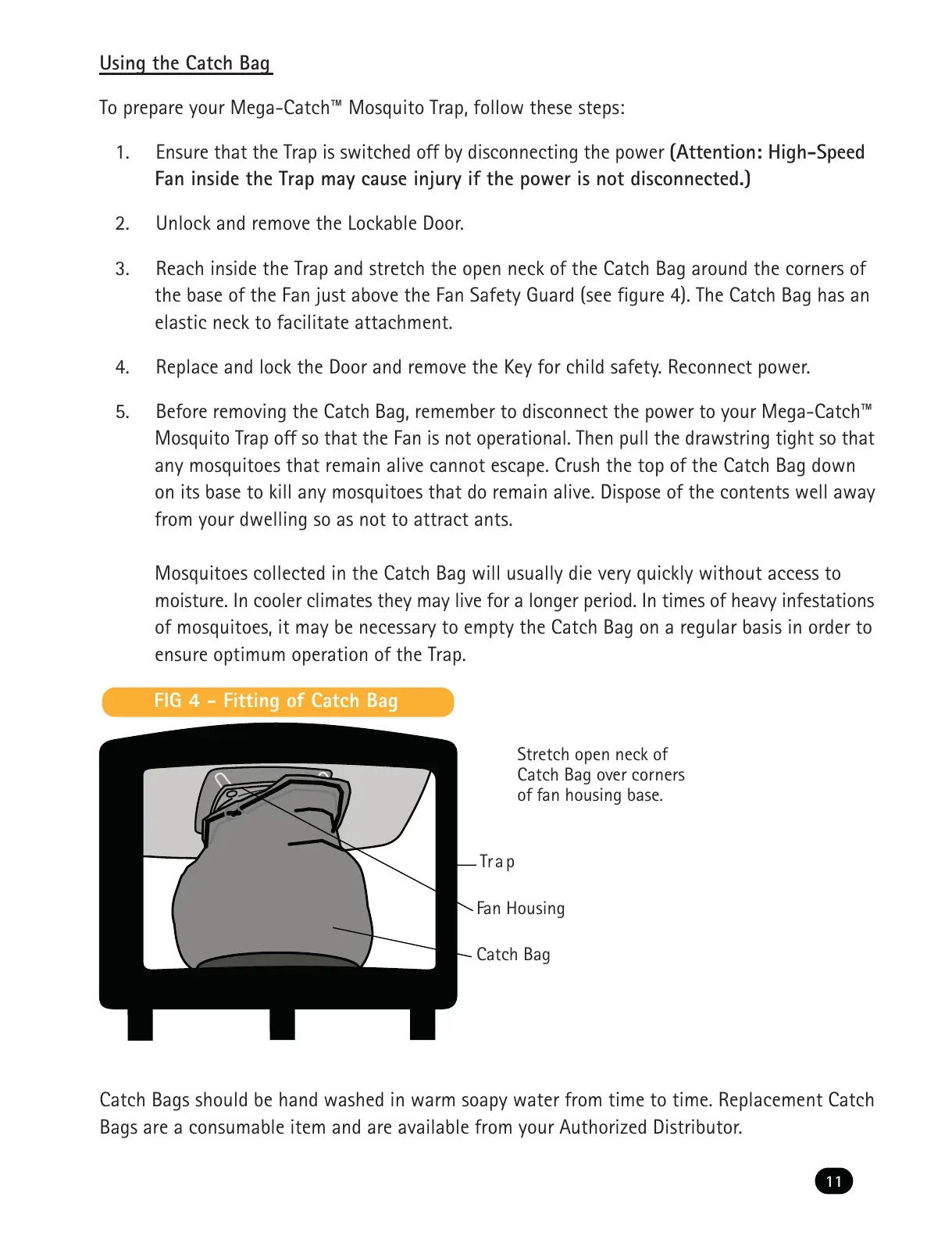 the base of the Fan just above the Fan Safety Guard (see figure 4). The Catch Bag has an