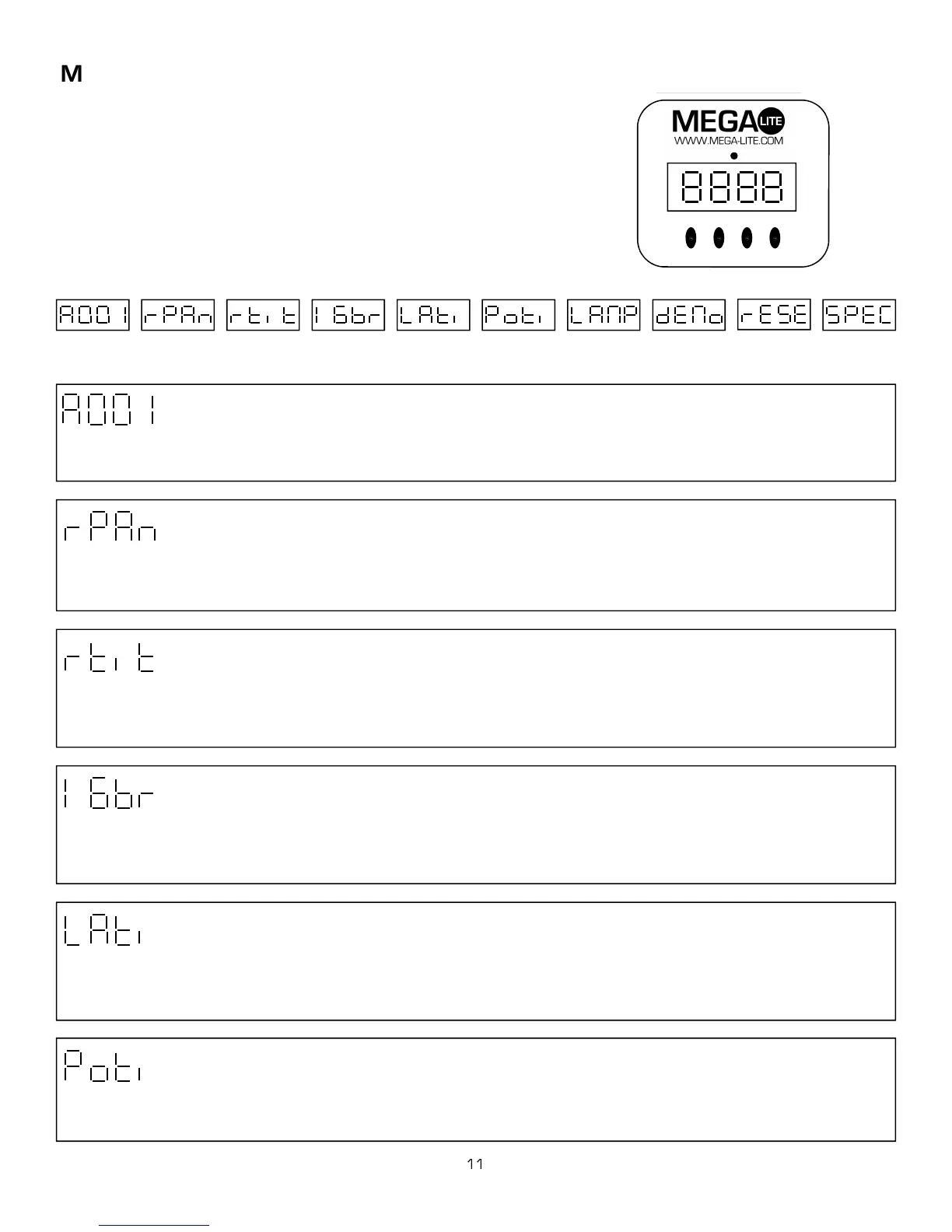 unit will operate on 16 or 14 channels of DMX. Use the up/down keys to select, on to select 16 bit resolution and off to select