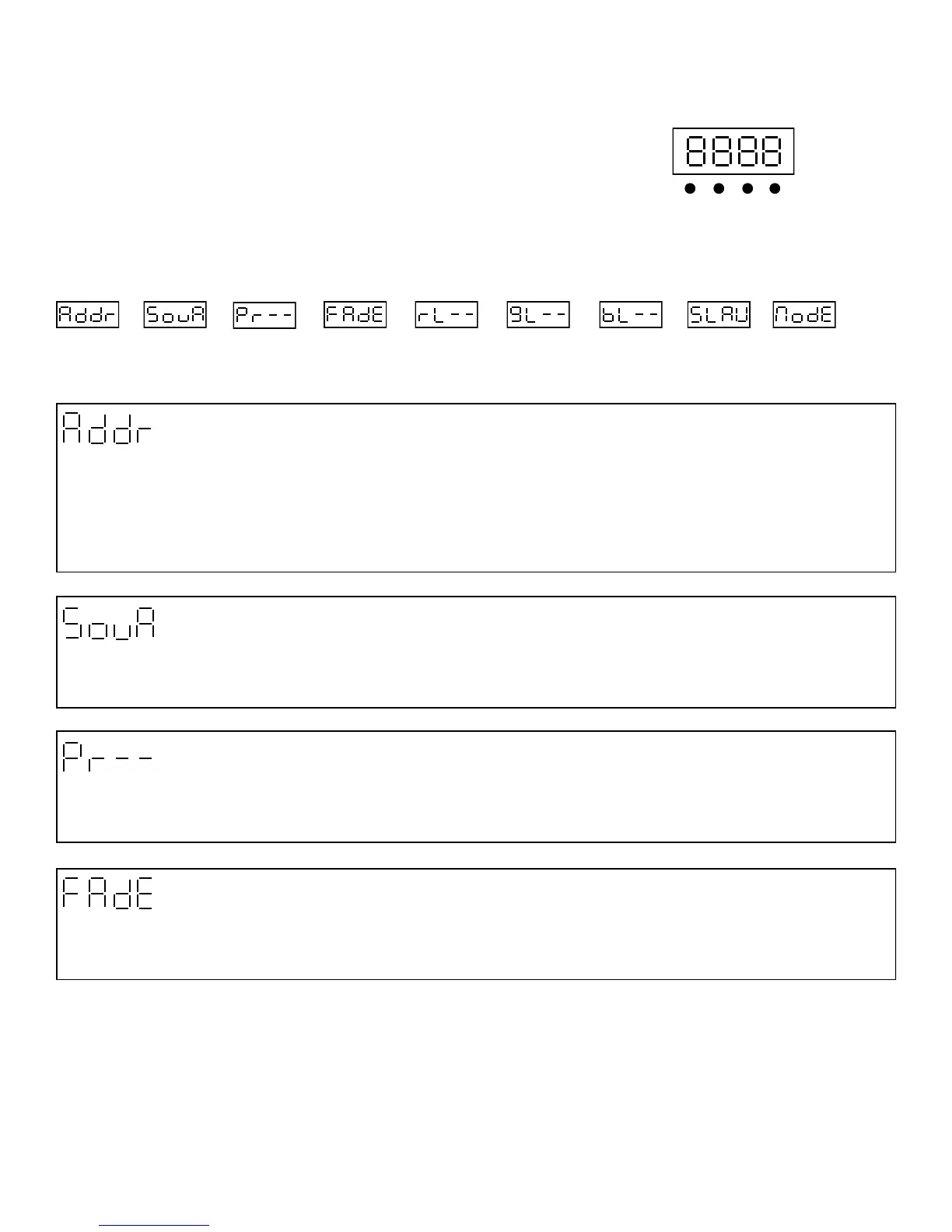 Press Enter to select the DMX start channel use the up/down keys, display will be flashing once you have selected the de-