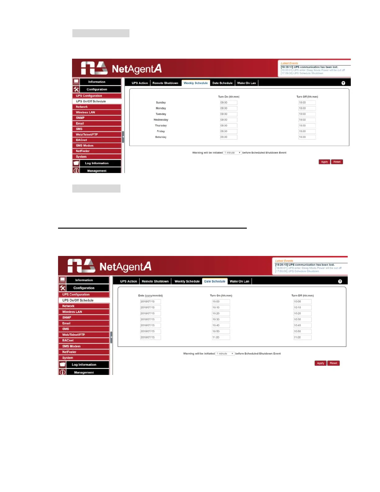 NetAgentA will send a warning message before a scheduled shutdown. This section sets