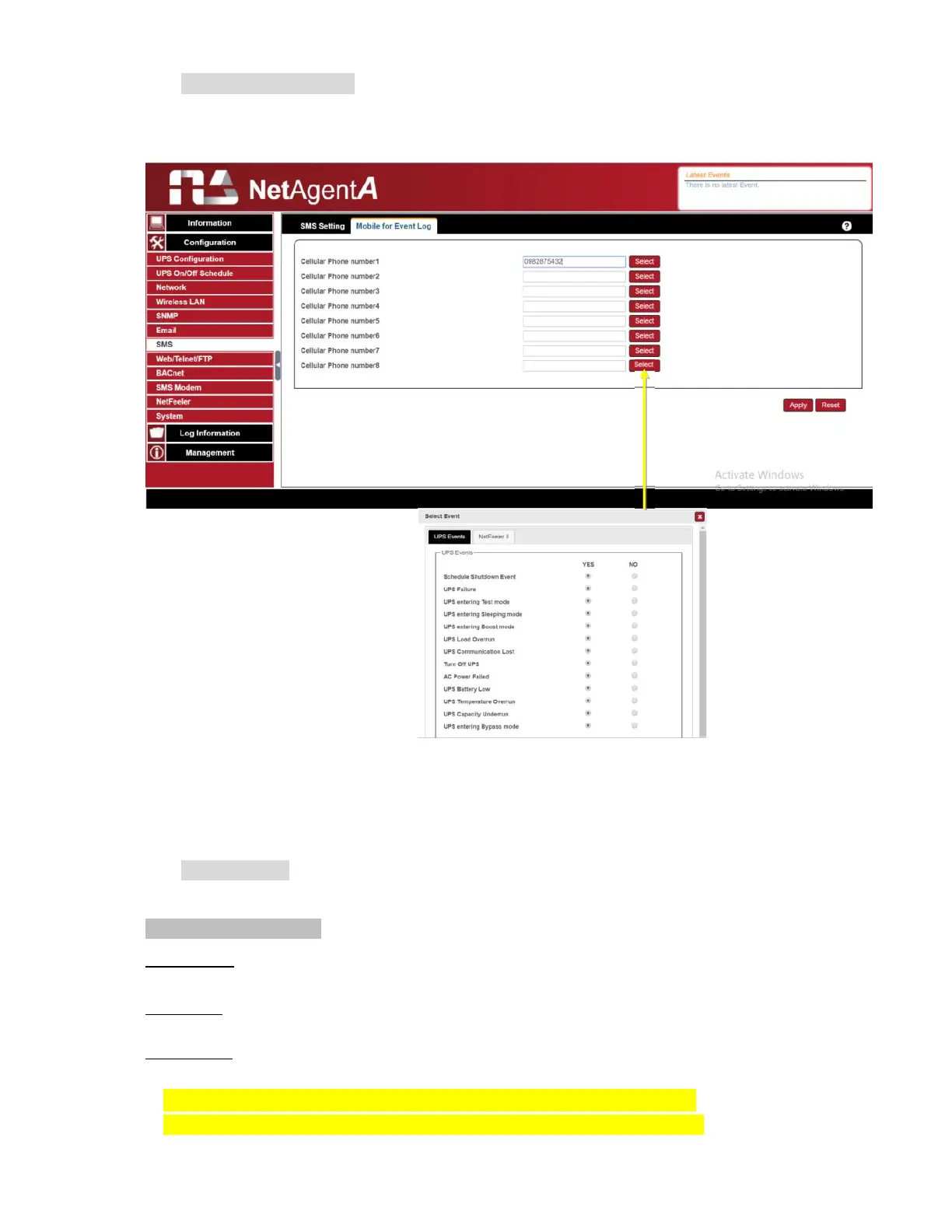 To set the recipient’s mobile number for SMS notification when event or NetFeeler event