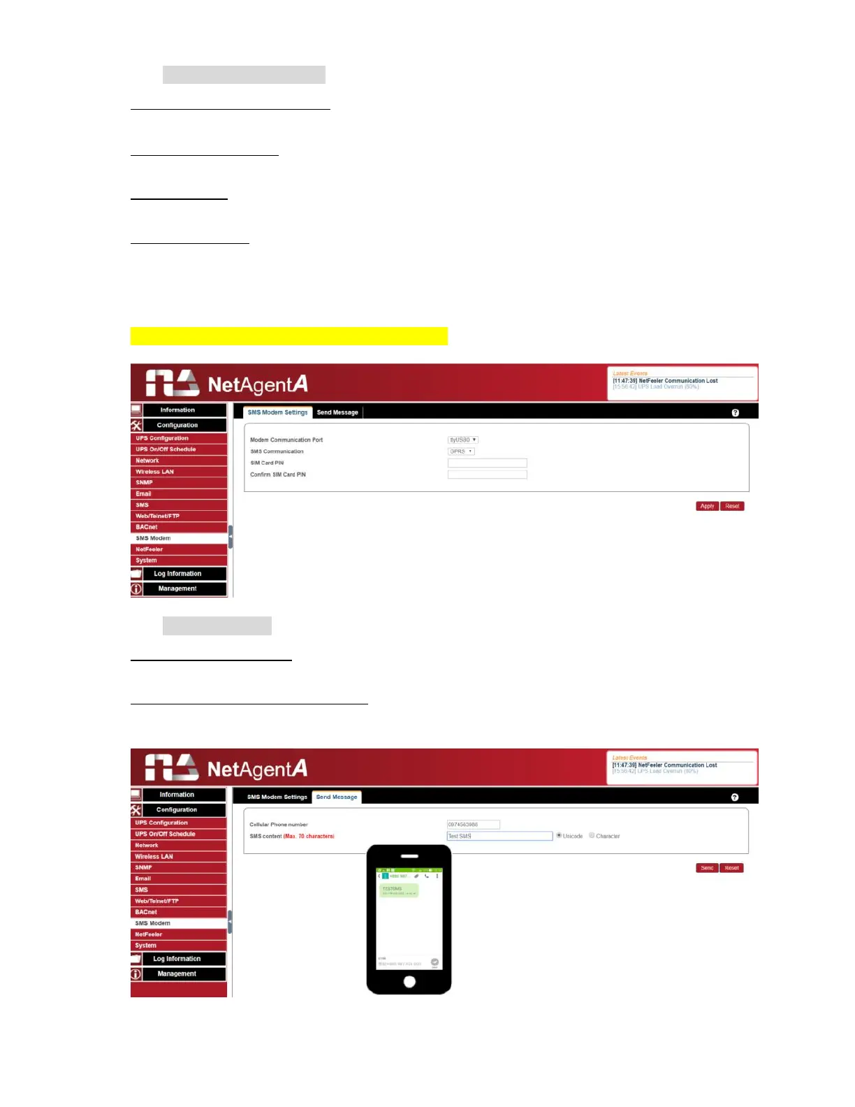 Enter the SMS content text and select coding. Unicode or Character