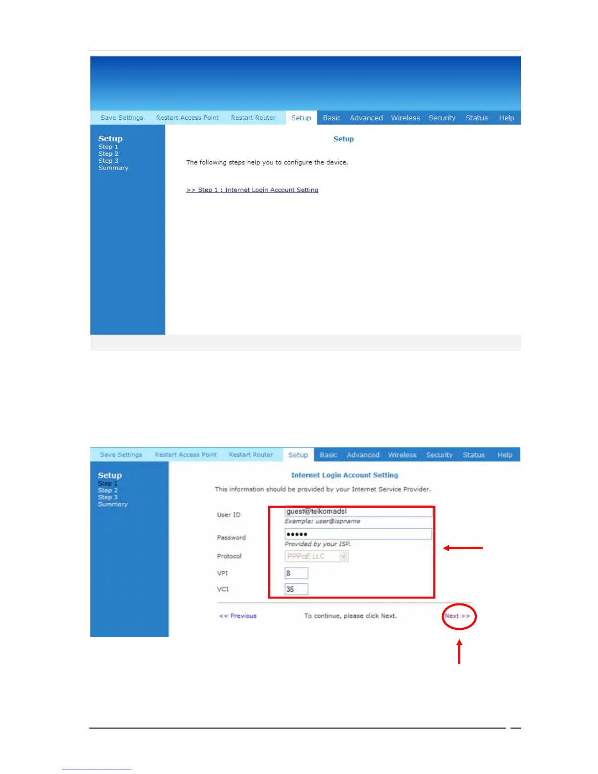 VPI , VCI or PPPoE setings unless your ISP has requested this . Click on Next to continue .