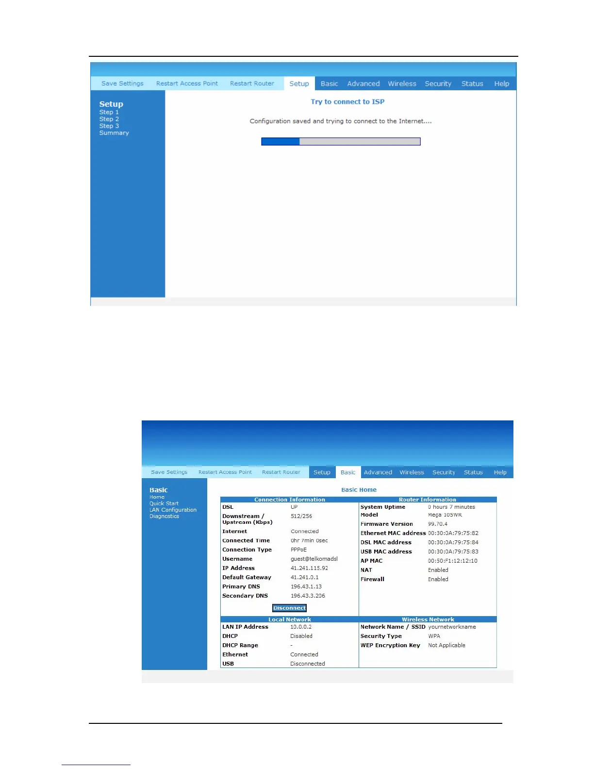 Mega 105WR - 4.1.2. Subsequent Logins; Figure 4-7: Trying to Connect to ISP; Figure 4-8: Basic Home