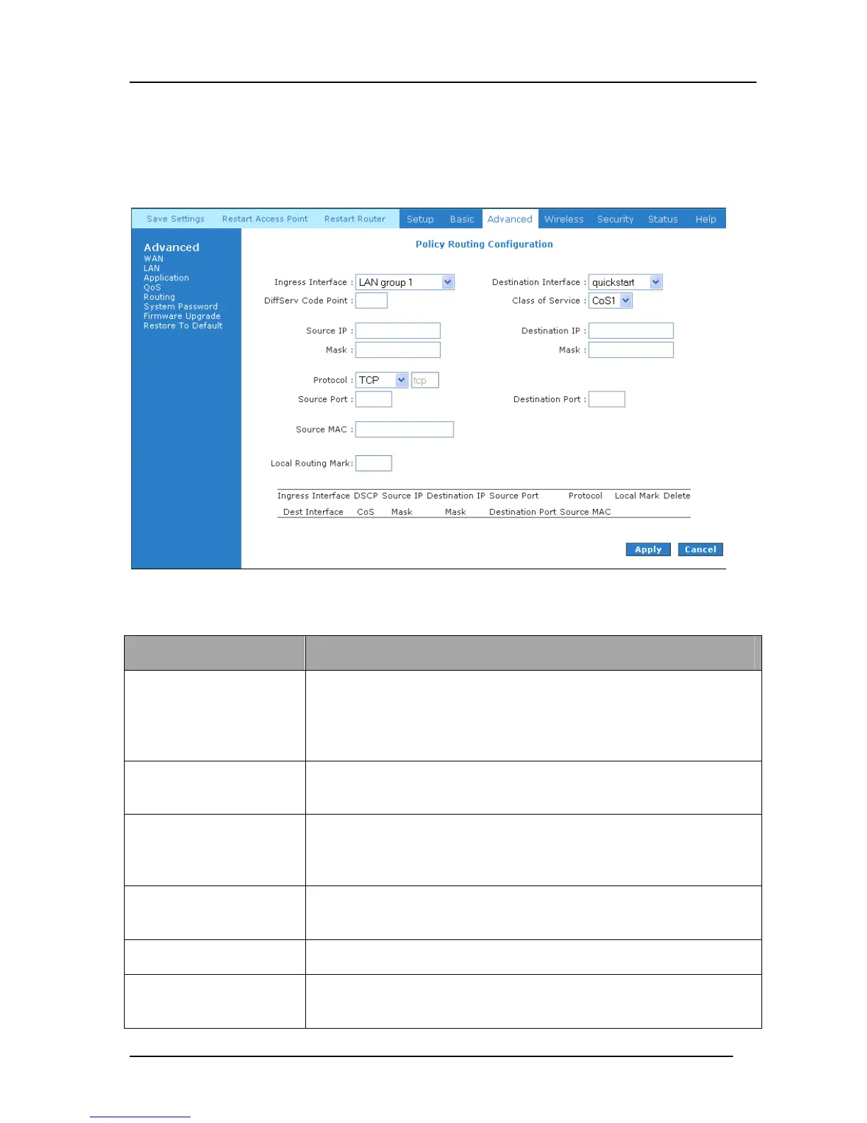 Routing Configuration on the Advanced home page under QoS. This page enables you to