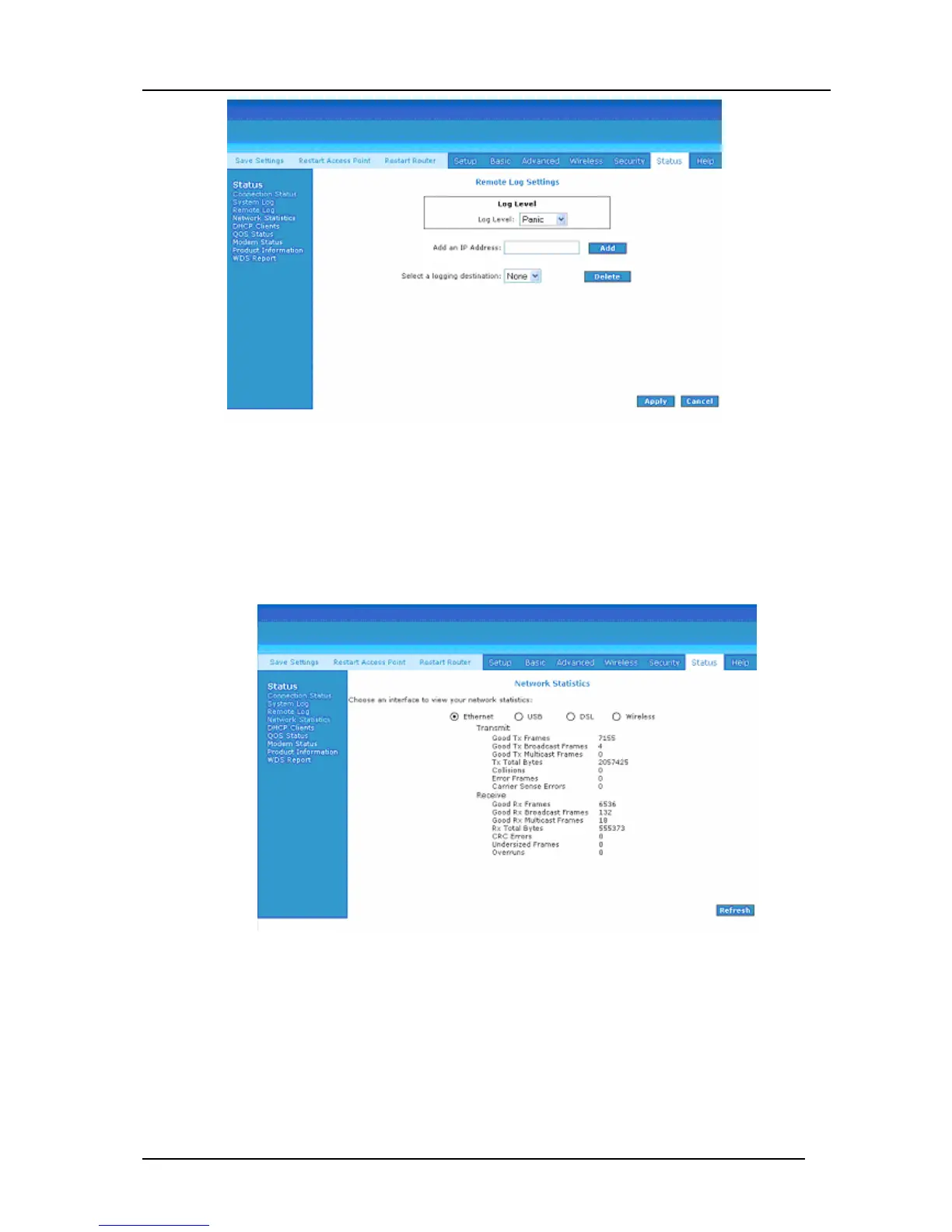 Information regarding the Status and Statistics of your Ethernet, USB, DSL and Wireless