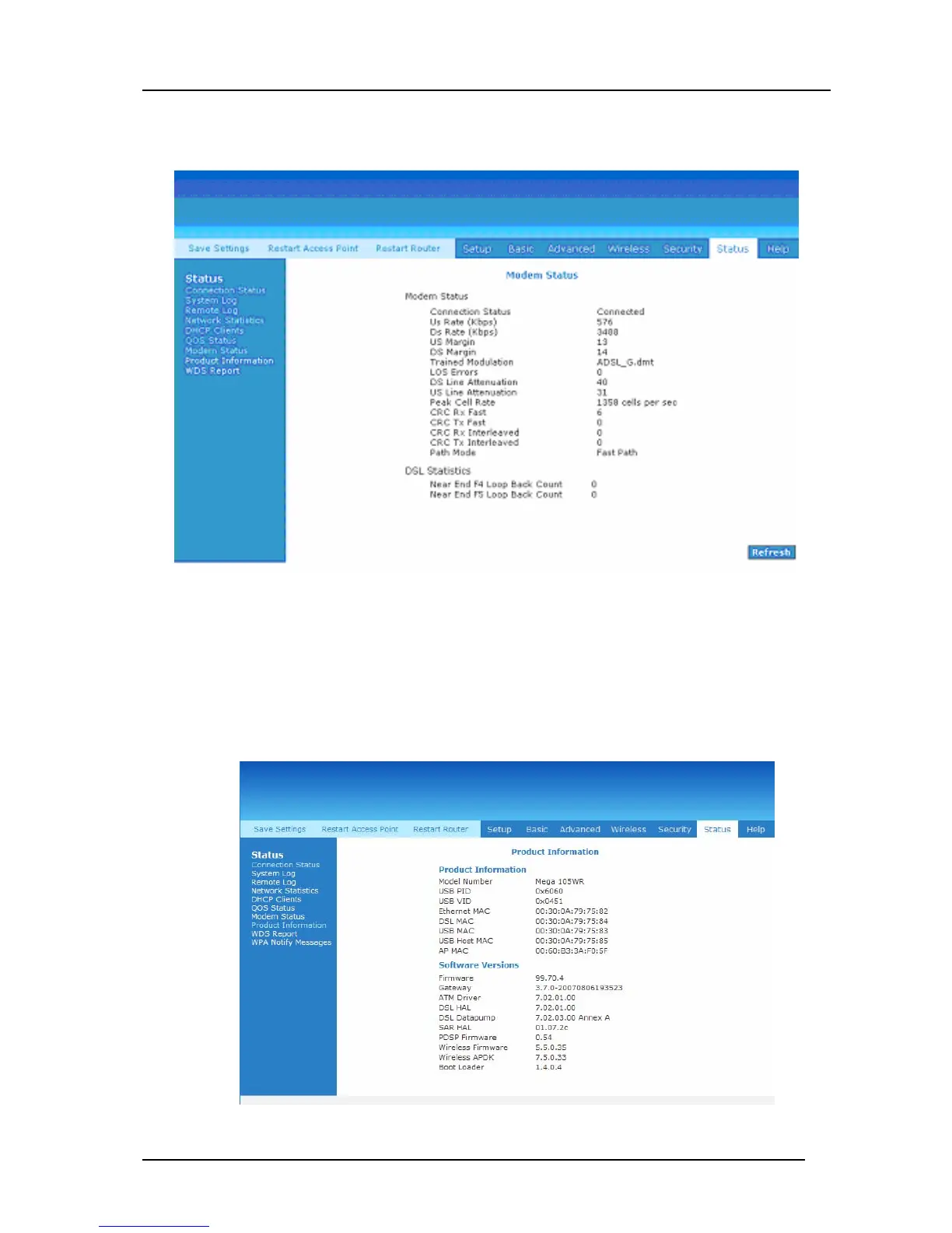 The page in Figure 4-75 displays the Modem status and DSL statistics as shown in.