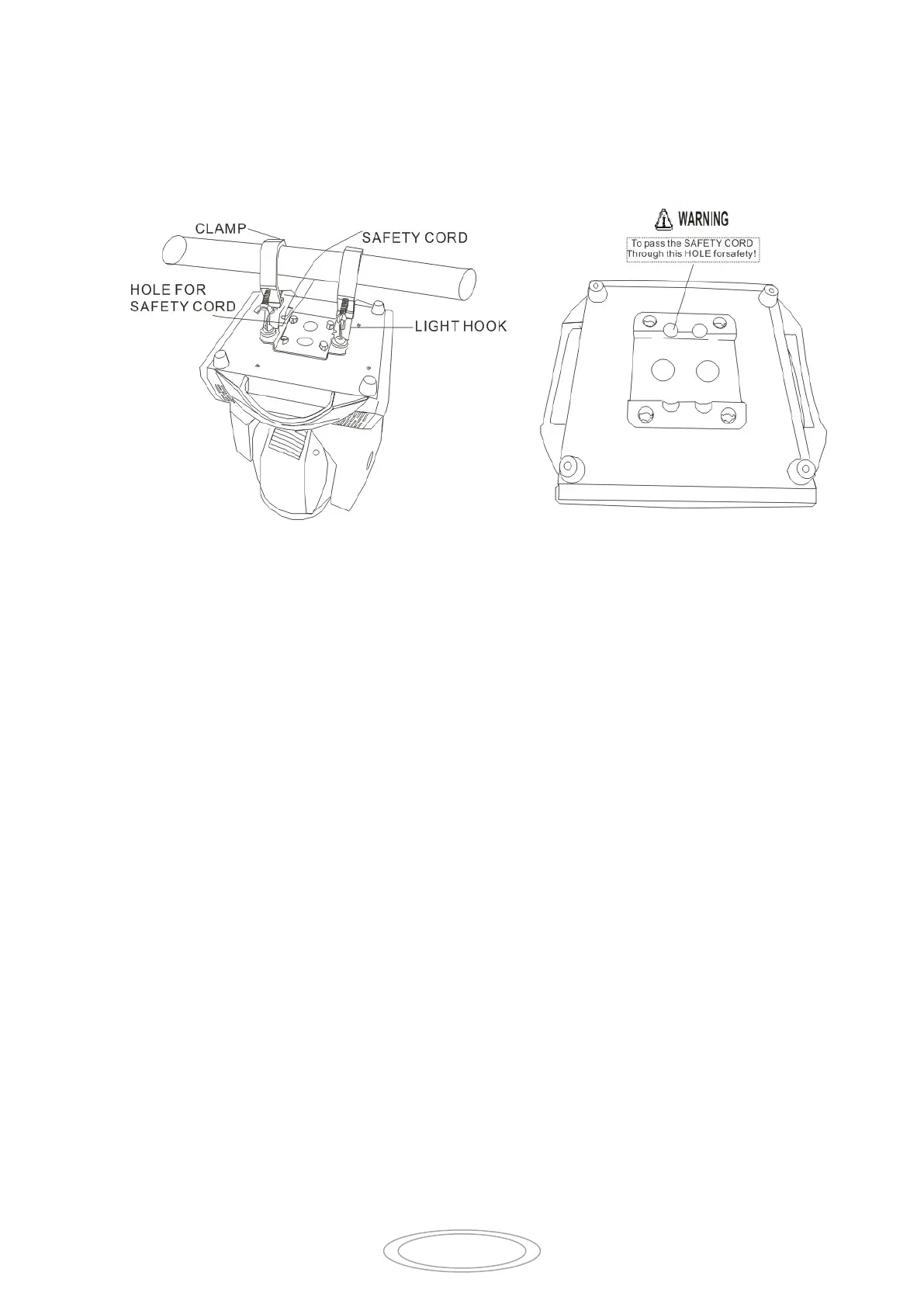 Use 2pcs clamp and 1safety cord(need to purchase).Use clamp fix with light hook which in the