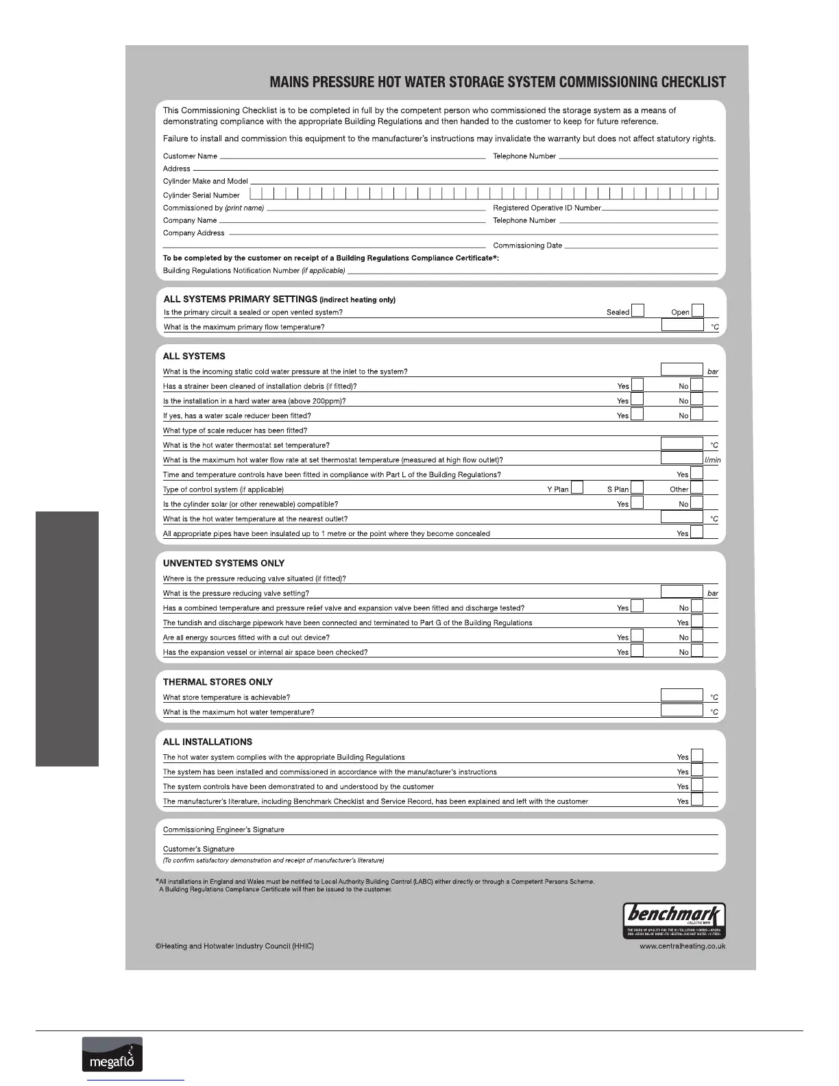 MEGAFLO Eco - Mains Pressure Hot Water Storage System Commissioning Checklist