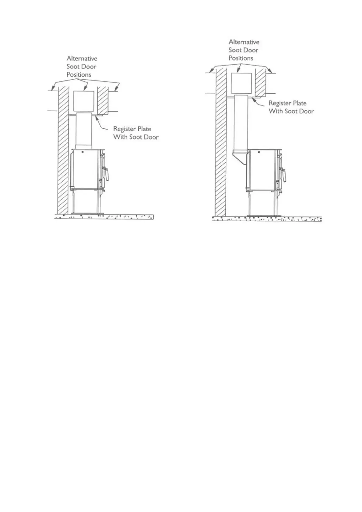 There are several ways of connecting the fireplace to the flue as shown in Figures 8 & 9. If the