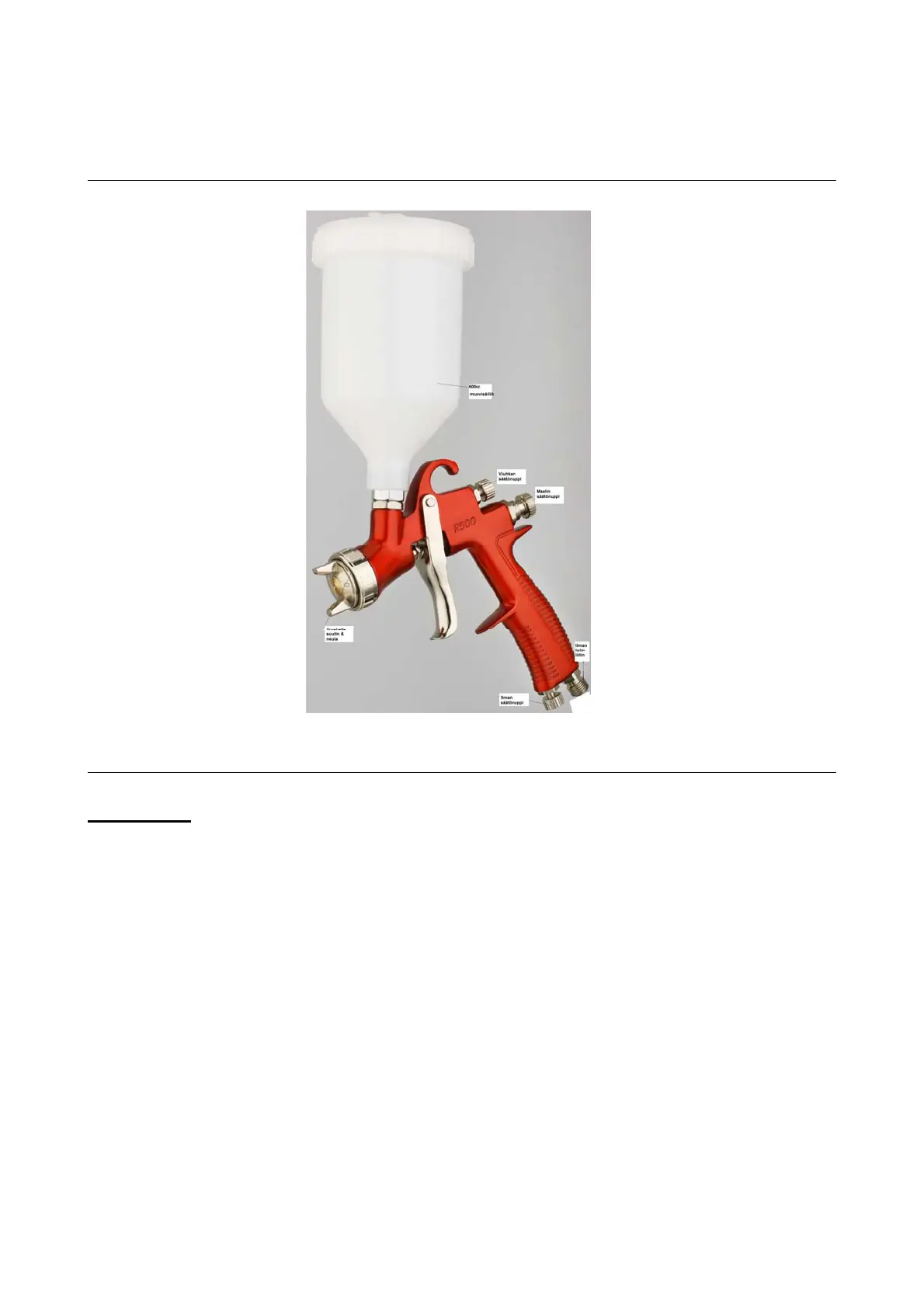 5. Kun olet kytkenyt pistoolin paineilmansyöttöön, varmista, että nestehattu, säiliö ja ilmaletku ovat kiinnitetty-